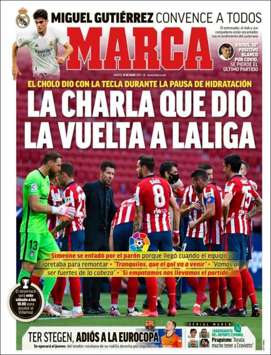 Para terminar de incrementar el sarcasmo, curiosamente, durante la pausa de hidratación resulta que no se hidrató nadie. Fue una pausa de agua sin agua. Sea como fuere, y mientras este asunto no se explique bien, es inevitable sospechar que la intención de Marca con esta primera plana es la de chotearse del madridista. Sabe que hay polémica con la acción y destaca que gracias a esa acción el Cholo dio con la tecla para que el Atleti remontase.