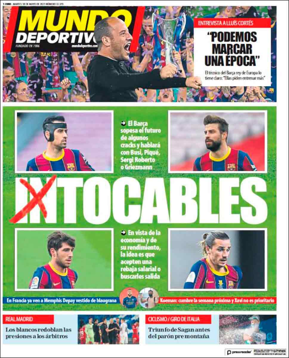 El titular del diario de Godó indica que vacas sagradas como Busquets o Piqué dejan de ser intocables. ¿Significa eso que dejarán de gozar de impunidad arbitral? No, no nos hagamos ilusiones, se refieren a que el Barcelona intentará que se bajen el sueldo o que se marchen.