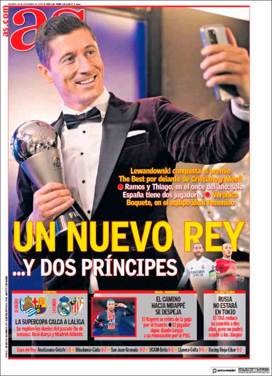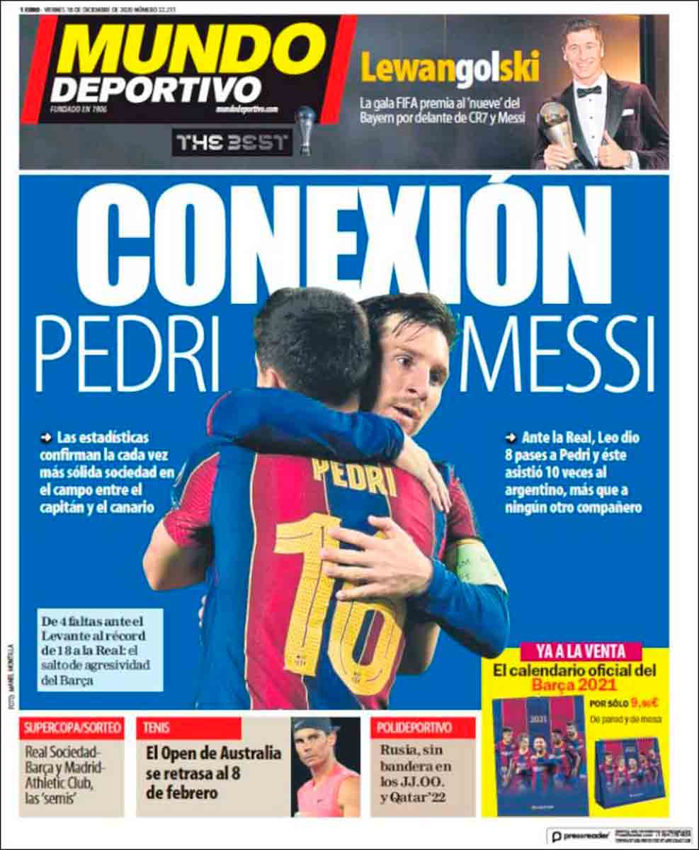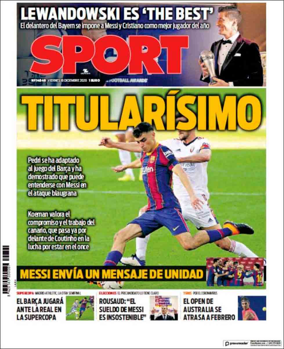 Buenos días. Mañana sosaina a más no poder en el portadismo nuestro de cada día. Pedri es premio The Best, se destaca la conexión Messi-Marcos Llorente y Lewandoswki es titularísimo en el Barça, o algo así. Igual se nos ha colado algún gazapo o confusión en lo que acabamos de escribir, pero si no es eso se le parece mucho. La combinación del sopor matutino con la completa falta de interés de los argumentos portadiles puede obrar catástrofes inopinadas.