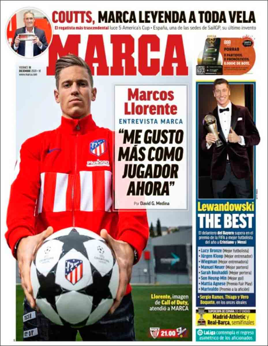 Para cerrar la mañana, portadescamente hablando, nos queda la entrevista exclusiva de Marca con Marcos (valga la redundancia) Llorente, jugador en espléndida forma a quien deseamos lo mejor por su calidad y por el contraste entre su actitud y la que tienen otros exmadridistas, sobre todo si acaban vistiendo la camiseta del Atleti. Marcos vive ajeno a la demagogia de los que pretenden ganarse a su nueva afición a punta de desprecio retrospectivo por los blancos colores donde se criaron, y solo por eso merece nuestra simpatía y mejores deseos en el plano individual.