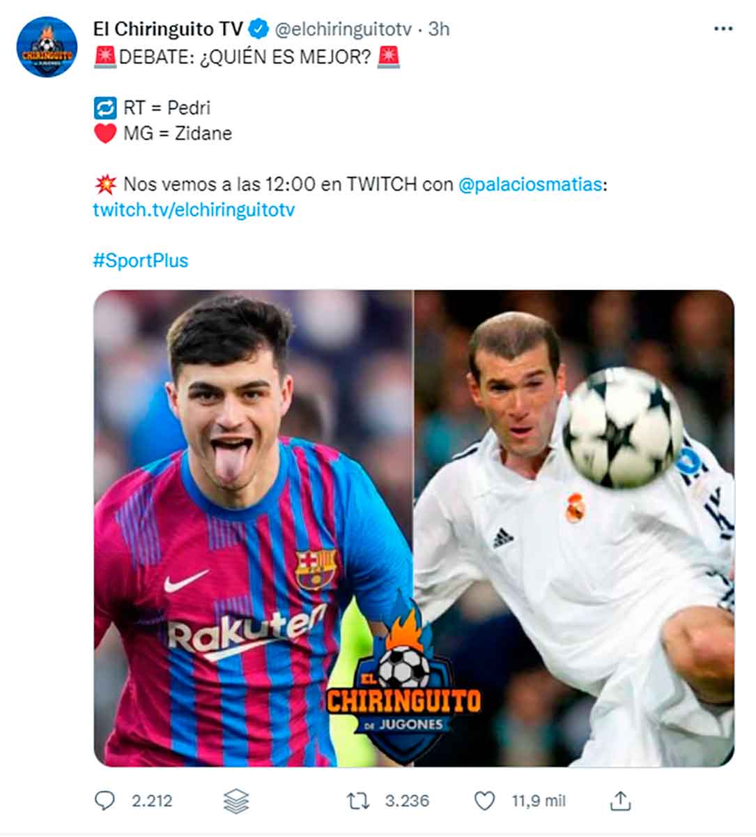 ¿Vosotros qué opináis, amigos? ¿Es mejor Pedri o Zidane? Un amable tuitero se preguntaba si el tuit del Chiringuito se refería por ventura al Zidane actual. “Ni por esas”, le respondía otro amable tuitero. Pedri es, pese a su nombre de parvulario de extrarradio, un jugador que apunta indudables maneras, pero al que va ser imposible tomar en serio nunca por culpa de esa cohorte de aduladores, carente del menor sentido del ridículo.