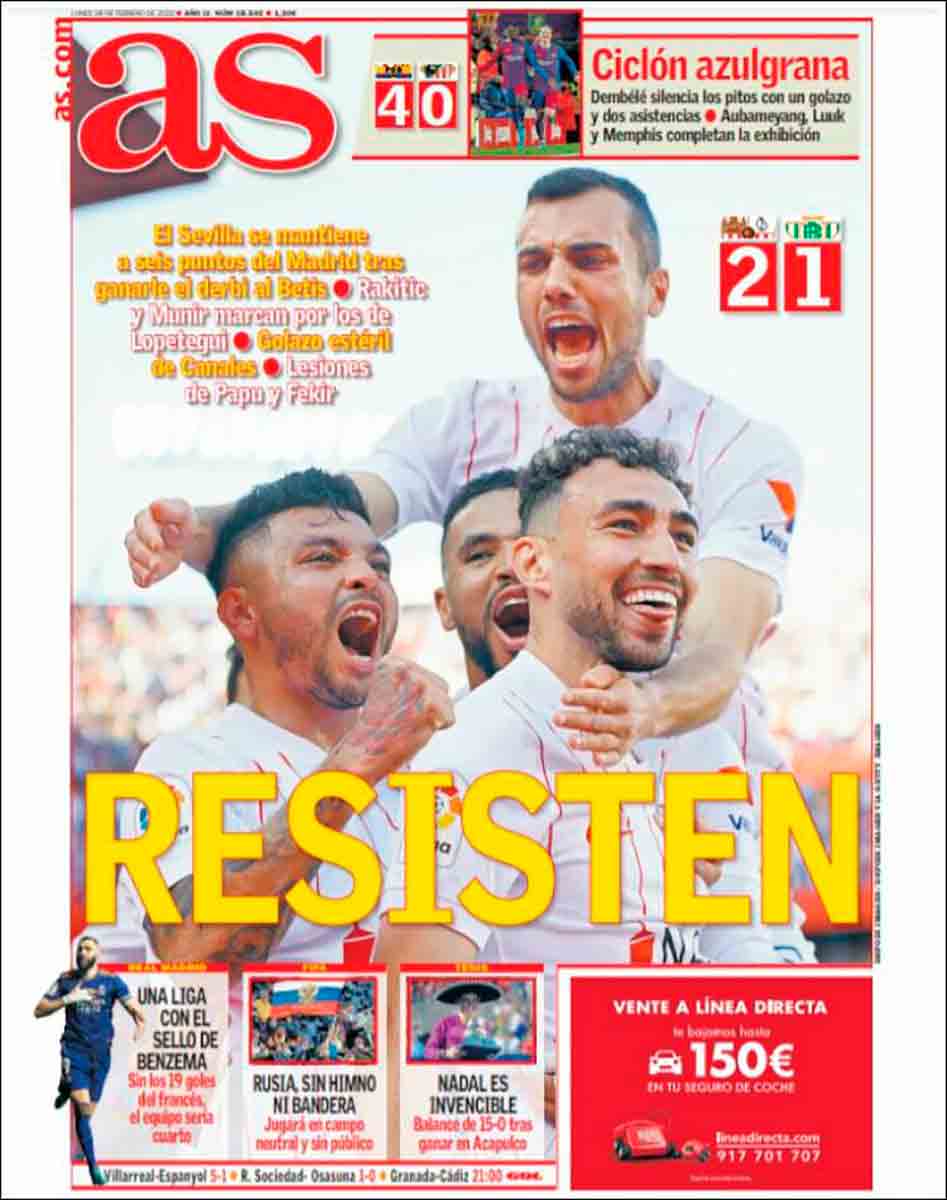 El Sevilla, que ganó 2-1 el derbi hispalense, tampoco cede, y es por ello que AS parece hoy editado a la mismísima ribera del Guadalquivir. El As tiene un color especial, el As sigue teniendo a Vicente (Jiménez), nos sigue oliendo a azahar, él es de toda la gente. En letra pequeña mira As desde lo alto de la Giralda en dirección al Kremlin para informarnos de que Rusia jugará en adelante, a modo de sanción, en campo neutral y sin público. “Rusia, sin himno ni bandera”, se atreven a anunciar, en evidente exageración. A nosotros no nos apetece que Rusia se quede sin himno ni bandera. Lo que nos gustaría es que se quedara sin Putin.