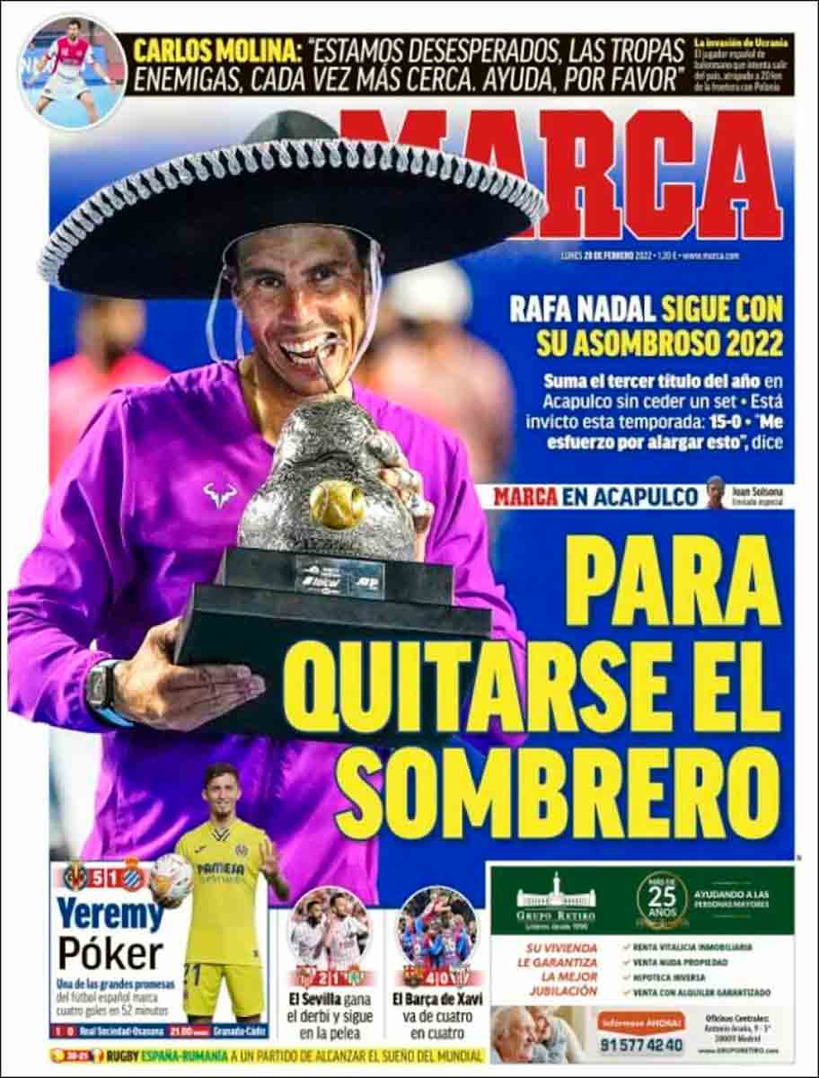 Finalizamos, con Marca, felicitando una vez más al Real Madrid de tenis, ese coloso sin parangón que responde al nombre de Rafa Nadal y que sigue agrandando (ayer en Acapulco) su descomunal leyenda.