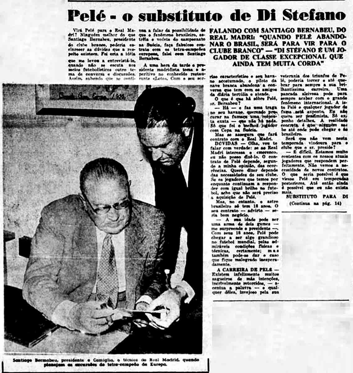 Santiago Bernabéu era el presidente más conocido el fútbol mundial y en el verano de 1958 acudió a Suecia para presenciar el Campeonato del Mundo. De primera mano vio al imberbe Pelé y lo apuntó de inmediato en su lista de futuros fichajes. En total fueron tres años tras él, con innumerables noticias y rumores sobre el interés o posibles ofertas por la perla sudamericana. En los periódicos brasileños corrió mucha tinta sobre Pelé y el Real Madrid y en la prensa española también se hicieron eco de todo lo que llegaba de la otra parte del Atlántico.