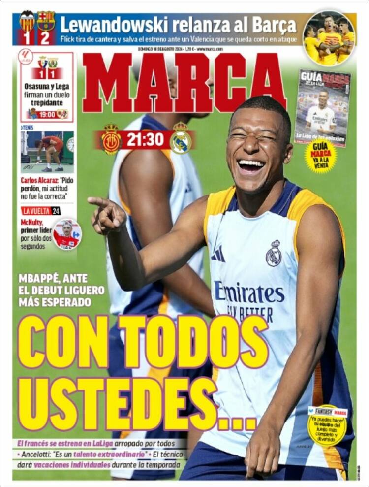 As y Marca, por su parte, prefieren hoy abrir con el partido debut del Madrid en la competición, que tendrá lugar a las 21:30 ante el Mallorca, en Son Moix. Dice As que va a ser "la liga de Mbappé", y nos gustaría que no se equivocaran, no tanto porque realmente sea la liga de la estrella francesa sino porque, de serlo, NO será la liga de otras muchas cosas.