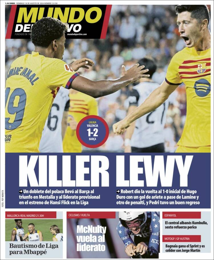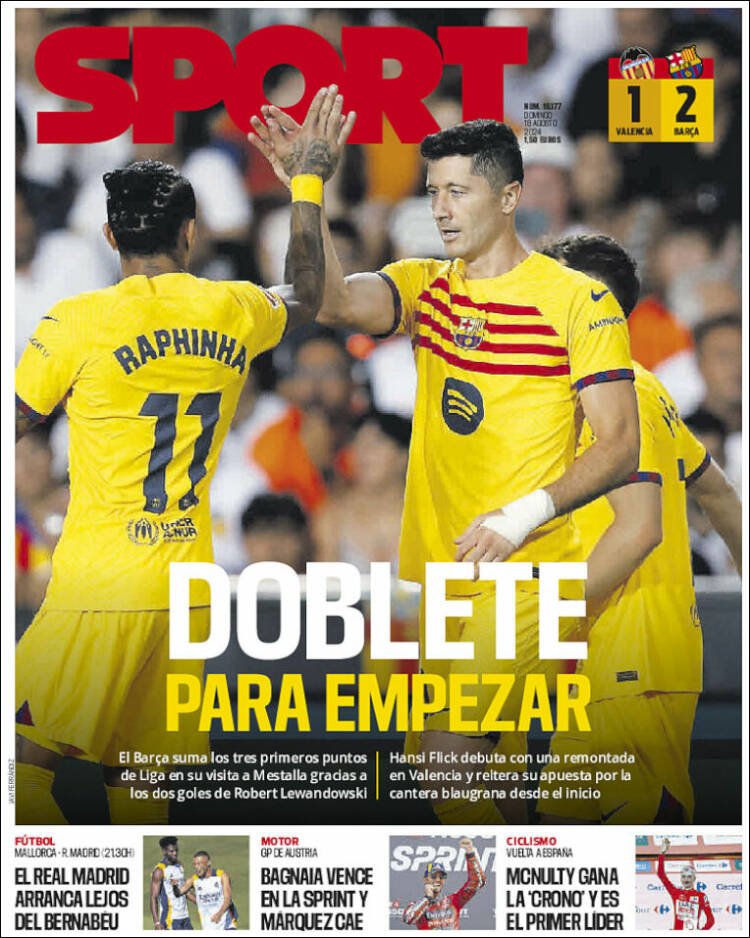 Tanto Sport como Mundo Deportivo destacan en portada a Lewandowski, autor de los dos goles de su equipo y por tanto principal hacedor de la victoria por 1-2, remontando el tanto inicial de Hugo Duro. Pero no prestan excesiva atención al hecho de que el segundo gol, el decisivo, llegara de penalti. Los mismos que se burlaron de Cristiano Ronaldo por el alto (?) porcentaje de goles que lograba desde el punto fatídico, motejándolo de "Penaldo", no parecen excesivamente inclinados a llevar a cabo un estudio parecido para el polaco. Lo dejamos en manos de los misterchips de turno, pero ya nos atrevemos a aventurar que el tanto por ciento de tantos de penalti por parte del excelente delantero no es nada desdeñable.Penaldowski.