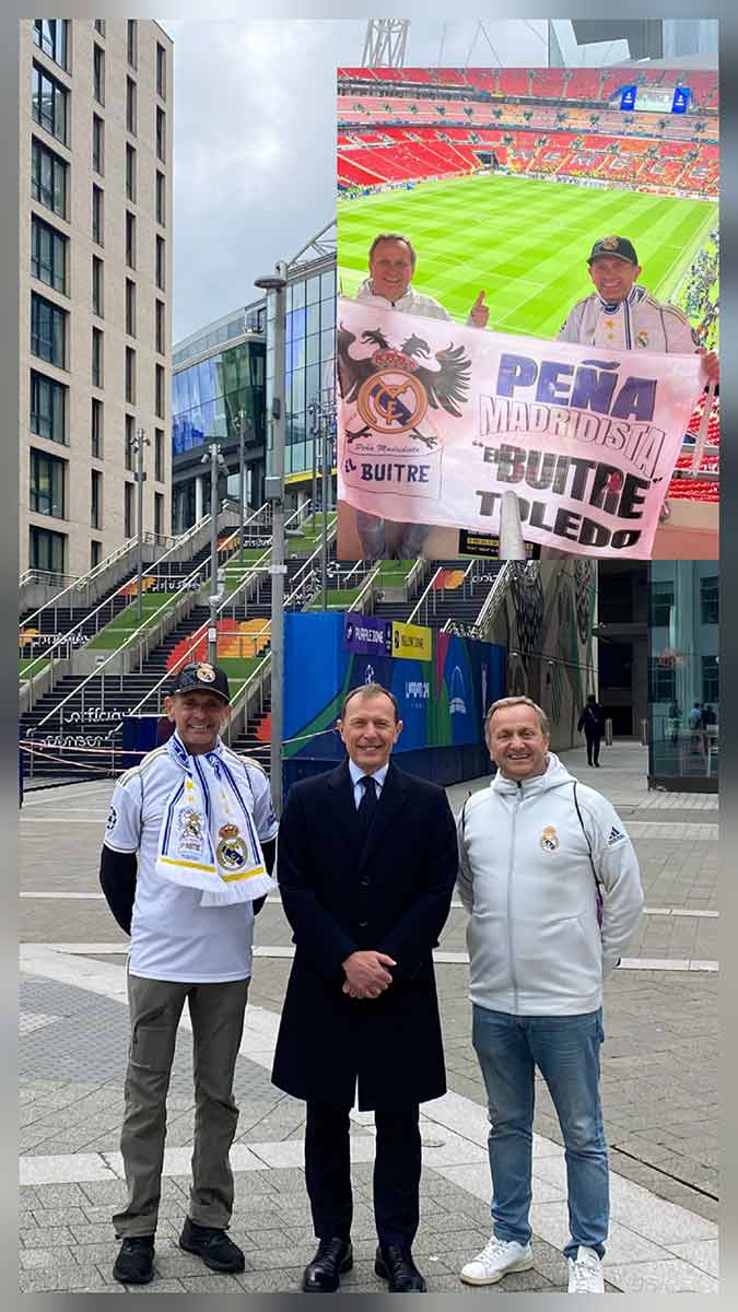 Tenemos relación con todas las que están en la provincia de Toledo: la de Recas, la de Ocaña, la de Talavera, la de Mora, la de Orgaz... También estamos en la Comunidad de peñas de Emilio Butragueño, en la Federación de peñas madridistas, pagando una pequeña cuota anual. Emilio viene mucho a mi parroquia aquí a Toledo, a San José Obrero. Viene a misa y tengo la suerte de poder confesarle, darle la comunión, acompañarle en la fe, porque él es un hombre de fe. También va al parque temático Puy du Fou a traer amigos, empresarios, etc. Él, por supuesto, también tiene detalles con nosotros: nos ha llevado al palco del Bernabéu, a distintos eventos, etc. Bueno, ¡espero que esto sirva y que sigamos creciendo todos juntos alrededor del Real Madrid!