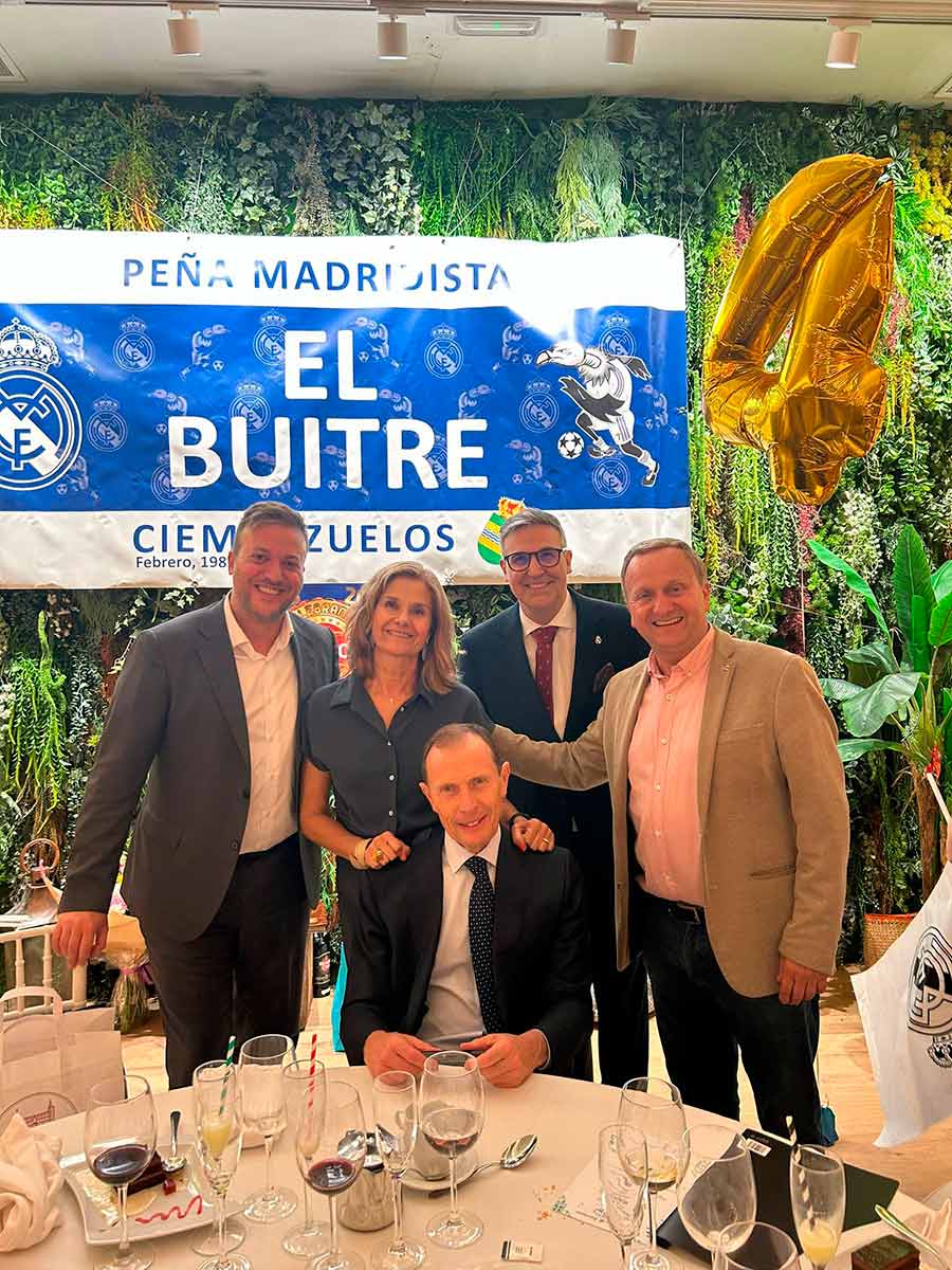 La meta es llegar a 500 peñistas, somos 400, antes de que celebremos 50 años. No olvides que hay peñas que ya tienen 75 años. Son pocas, pero ya las hay. Emilio Butragueño ha tenido unas 20 peñas con su nombre, ahora son menos, un total de 15. La de Damasco se ha disuelto por la guerra de Siria, la de Suiza también cesó de existir… Emilio ha viajado muchísimo y nuestra peña le ha acompañado por todo el mundo en las distintas inauguraciones de peñas que llevan su nombre. Todas las peñas con el nombre Buitre hemos tenido un encuentro en Alcalá de Henares el pasado noviembre, en el que estuvimos presentes, entre otros, los presidentes de las 15 peñas. Hacemos cosas conjuntamente, compramos lotería juntos, organizamos comidas, cenas, etc., y viene Emilio a compartir esos momentos con nosotros.