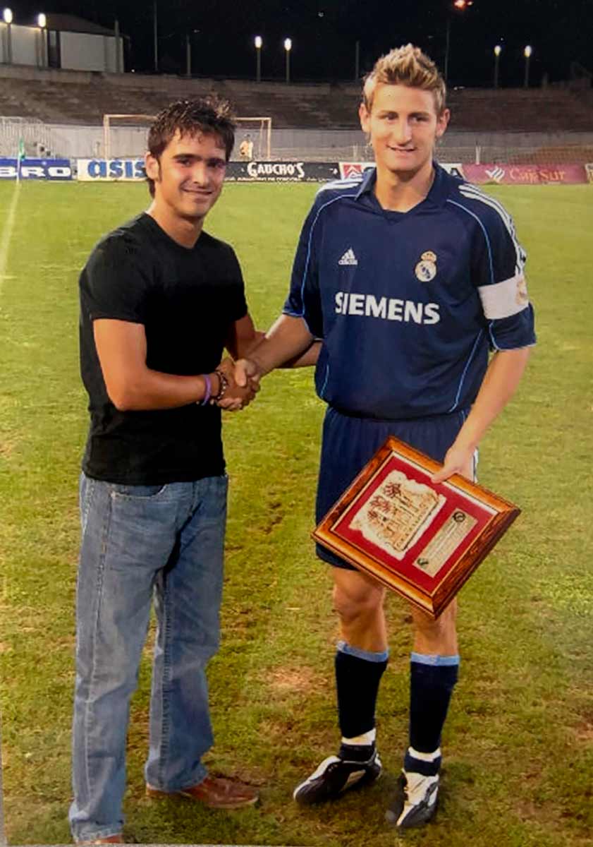 En 2005 y gracias a un buen amigo periodista, Antonio David Jiménez, pudimos hacer entrega de una placa conmemorativa por el Ascenso de Real Madrid B (actual Castilla) a la división de plata del fútbol español. El acto se produjo a pie de césped del estadio Nuevo Arcángel y fue entregada a Rubén, capitán del equipo. Para nuestra peña fue un momento especial, hizo que nos sintiéramos muy cerca del club.