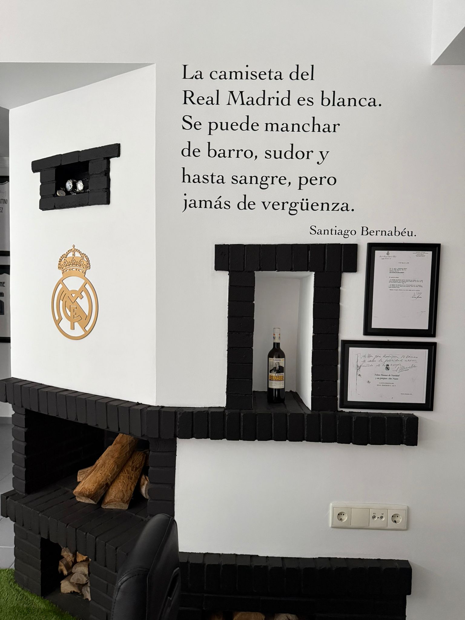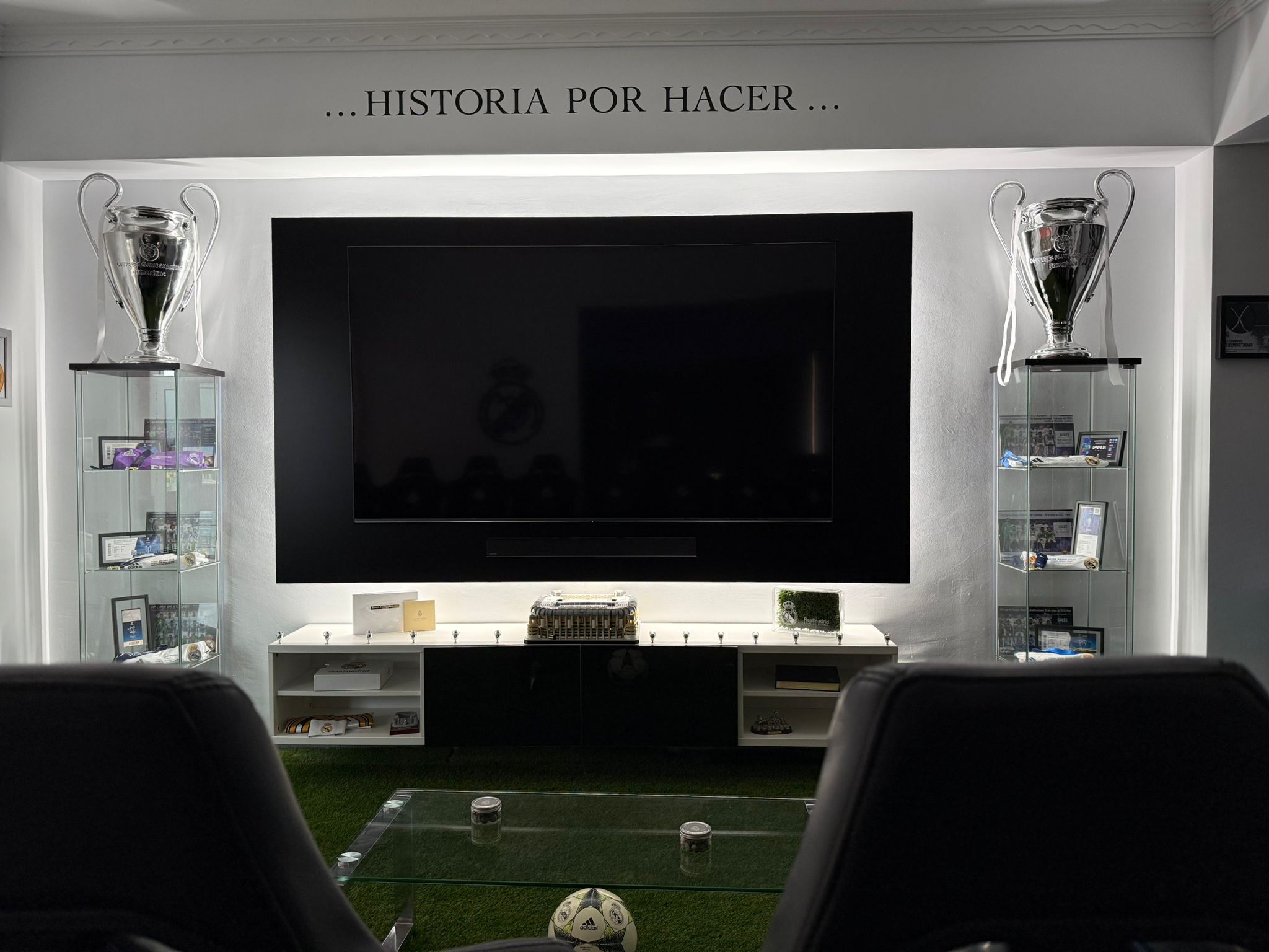 Por un lado, una enfermedad que tuve de pequeño hizo que Madrid se convirtiera en la ciudad que me volvió a ver nacer. Esto me lo explicaron mis padres con unos pocos años y de todo ello entendí que yo tenía una deuda que pagar con esa ciudad (y con ese Club que entrenaba a tan sólo unos metros de mi planta de críticos). Por otro lado, un golpe de suerte hizo que, alineándose los astros, pudiera presenciar un entrenamiento a puerta cerrada y un partido en el palco incluyendo una firma de jugadores al finalizar el encuentro: camiseta de Sergio Ramos y Cristiano Ronaldo firmada y fotos que ilustran ese momento formaron la base para sentir que todo lo que ya tenía, más estas piezas únicas, podían formar un espacio espectacular, no sólo para ver el fútbol, sino para vivir y hacer sentir madridismo a todo aquel que quiera venir a ver este espacio. Y a partir de ese momento tan increíble (marzo de 2012) no he parado de coleccionar objetos únicos con los que engalanar aún más lo que yo llamo EL TEMPLO.