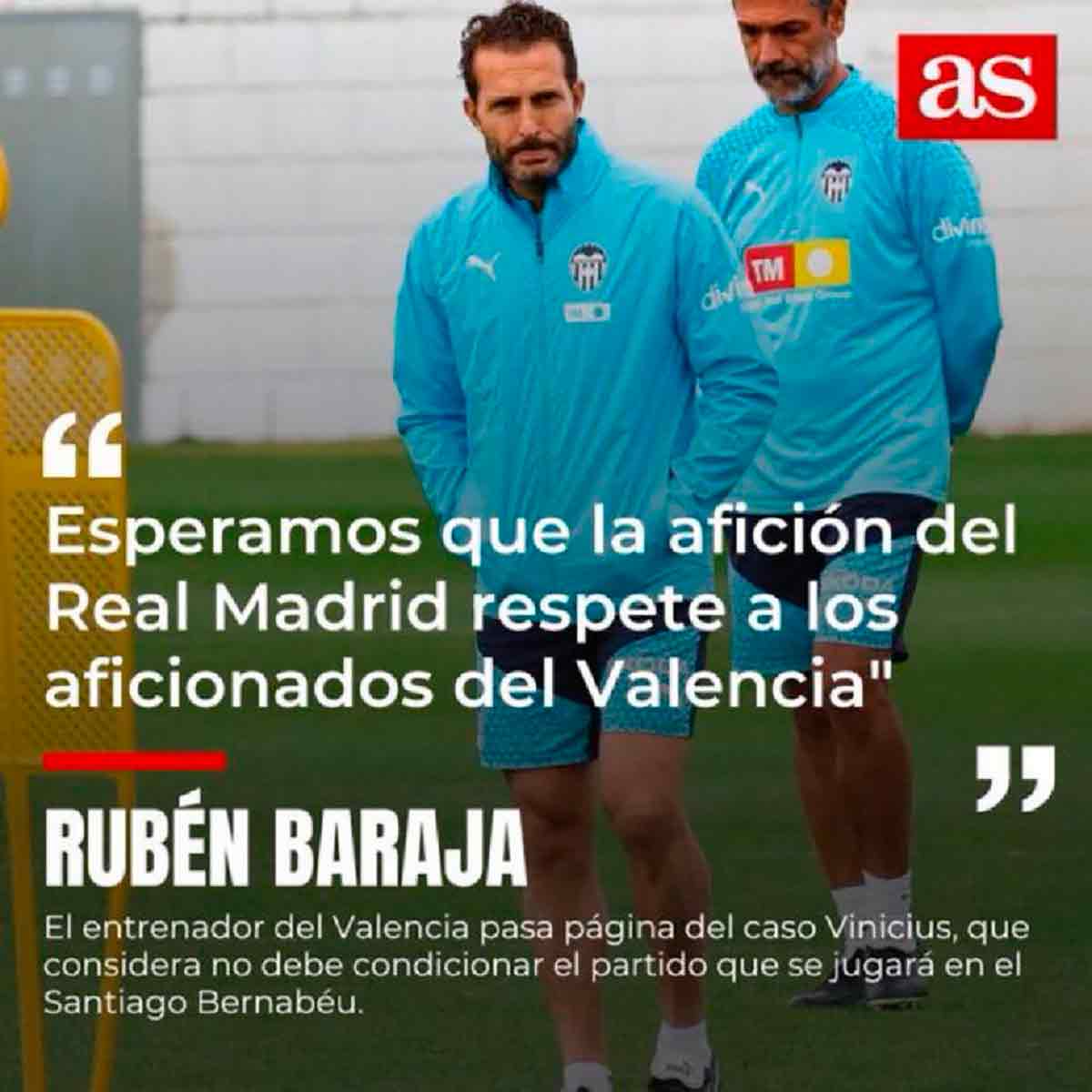 ¿Y por qué habría de tratarla de otro modo?, nos preguntamos curiosos. ¿Acaso Baraja proyecta sobre la afición del Real Madrid sus propios problemas de conciencia por la actitud de una parte considerable de su afición en la última visita del Madrid a Mestalla, con los conocidos incidentes racistas contra Vinicius?