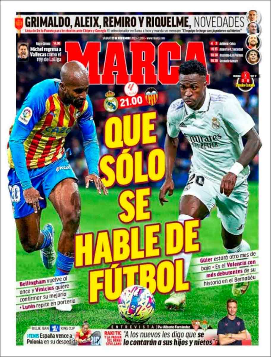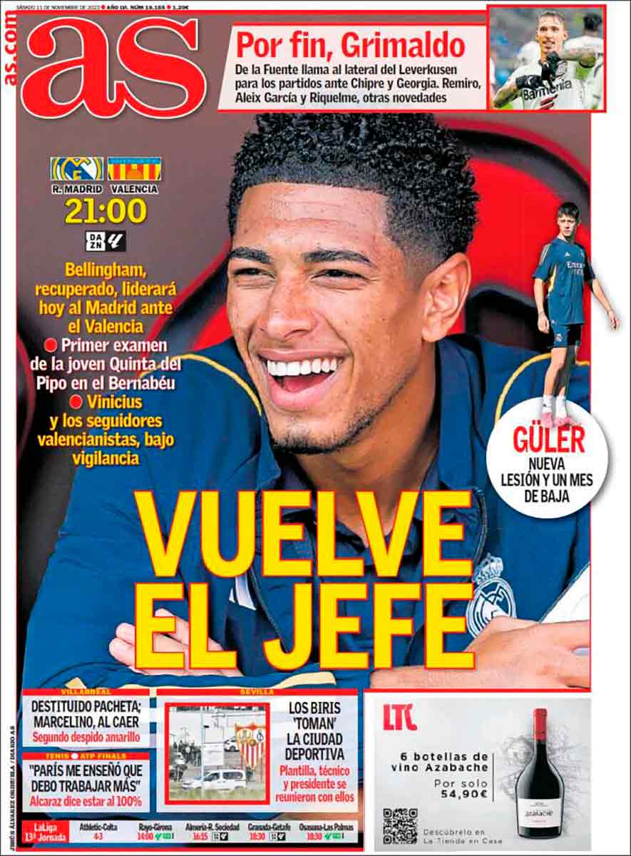 As se centra en lo positivo, poniendo el foco en el retorno de Bellingham tras ser reservado ante el Braga por sus ligeros problemas en el hombro. Hasta ahí bien, pero As nos desconcierta sobremanera cuando en letra pequeña reza “Vinicius y los seguidores valencianistas, bajo vigilancia”. Hoy nos va a doler la garganta de preguntar a la gente que qué dicen, pero qué culpa tendremos nosotros de que todo el mundo se haya vuelto loco. ¿Bajo vigilancia Vinicius? ¿Vigilancia de quién? ¿Vigilancia de qué? ¿De qué pretendéis hacer a Vini sospechoso, de manera directa o subliminal?