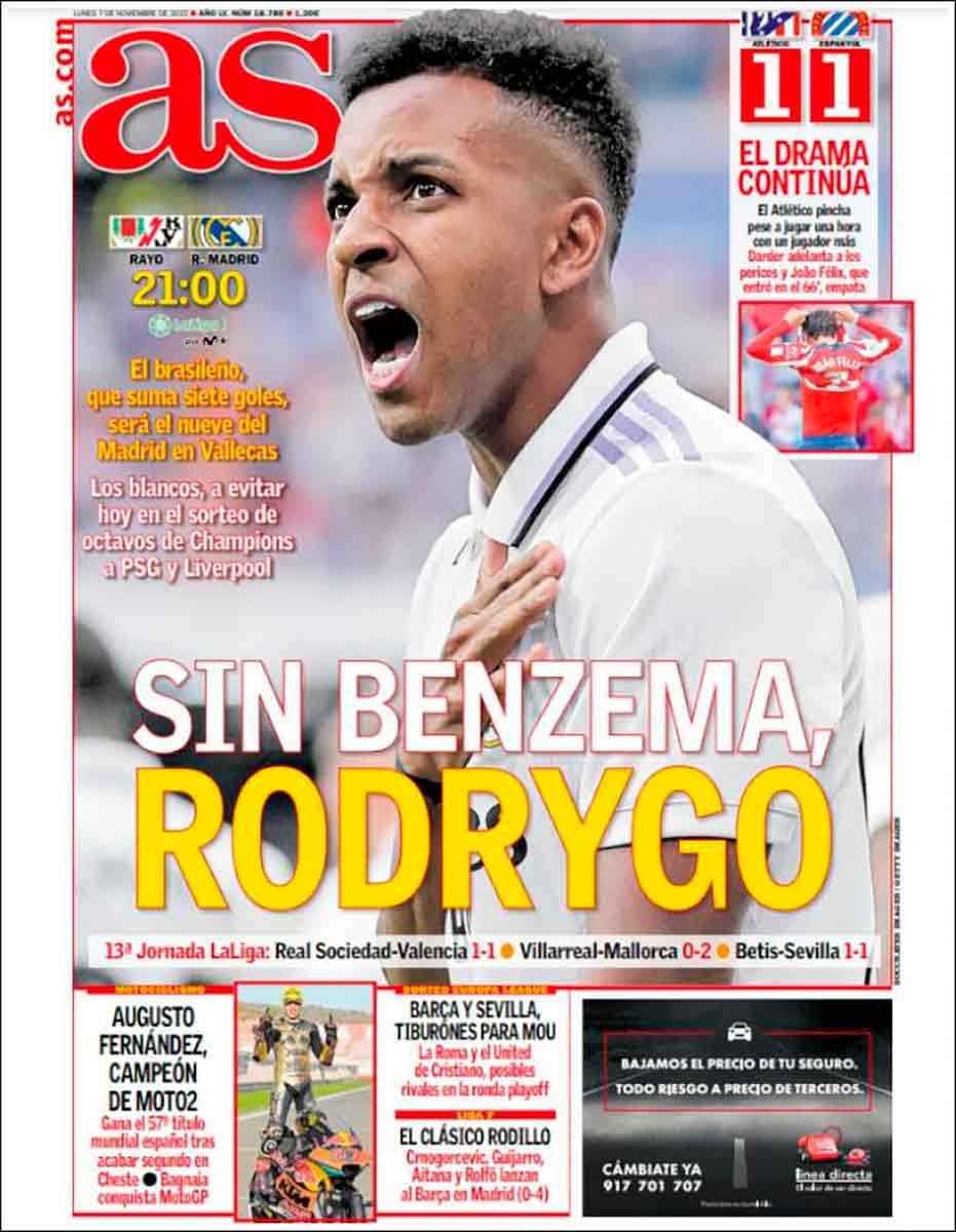 As en cambio da más importancia al encuentro de esta noche en Vallecas y a la importancia que en el mismo se prevé pueda tener el rapazinho Rodrygo, uno de los nuevos ídolos de la afición blanca, en ausencia de Benzema, que padece una “fatiga muscular” que tiene a parte de dicha afición algo mosca, dada la cercanía del Mundial. Creemos que Benzema no merece desconfianza, como también opinamos que esto debería explicarse bien para evitar suspicacias.