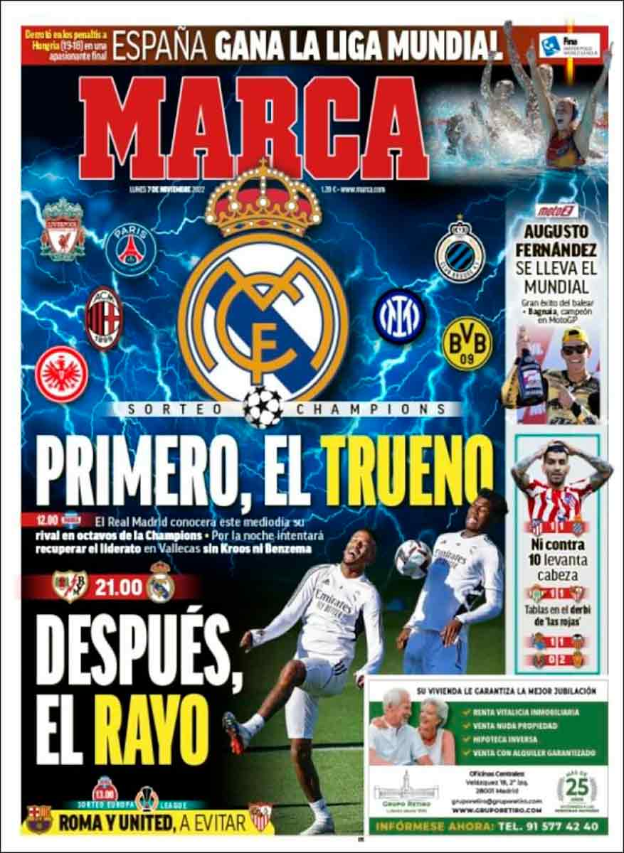 Las portadas se ventilan en dos patadas: hoy hay sorteo de Champions, donde por lo que sea el único participante español es el Real Madrid, y por la noche juega el propio Real Madrid ante el Rayo. Por eso habla atinadamente Marca de trueno y Rayo. Podéis seguir el sorteo en la cuenta de Twitter en La Galerna, no cobraremos mientras Elon Musk no nos obligue a ello.
