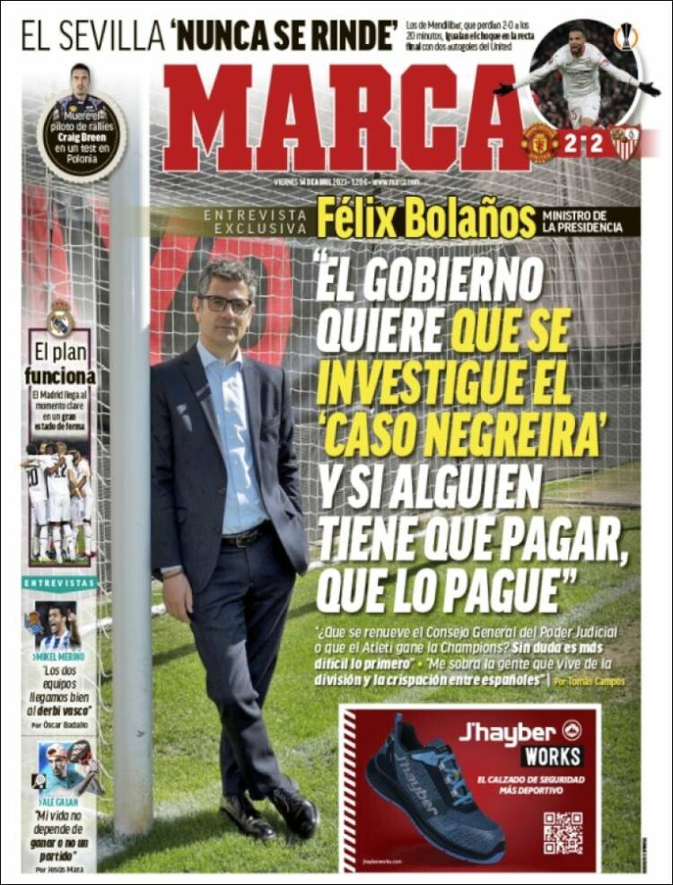 Buenos días. Marca trae hoy una entrevista con el Ministro de la Presidencia del Gobierno de España Félix Bolaños, que posa como el mismísimo Stole Dimitrievski bajo los palos. Decimos como Dimitrievski y decimos bien, porque Bolaños resulta ser aficionado del Rayo, y es allí, en las instalaciones del equipo vallecano, donde tiene lugar la entrevista.