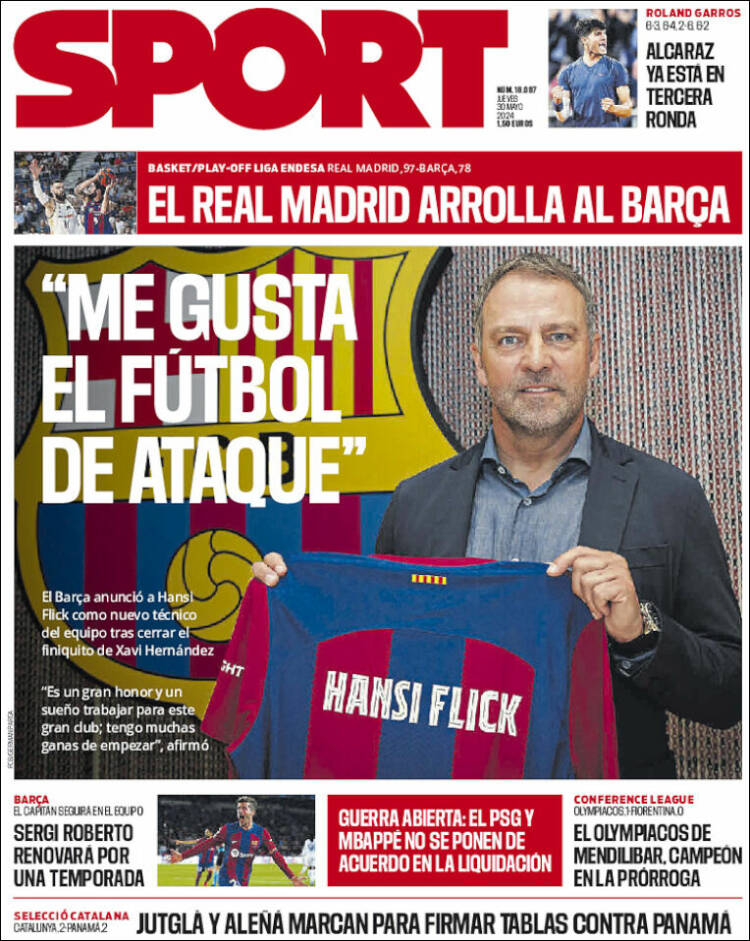 De la prensa cataculé, que ridículamente trata de contraprogramar la excitación de la Champions con el detalle de la nueva vida barcelonesa de Flick, sólo cabe destacar precisamente lo que con más pesar anuncian ellos, o sea, que el Real Madrid de Chus Mateo les dio ayer para el pelo (¿de dónde vendrá esa expresión?). Emergiendo de la desgracia de la Final de la Euroliga, y con un Llull descomunal, el Madrid de los canastos puso la serie del play-off de cara, y ya dispone de un ligero favoritismo para plantarse en la final de la ACB. 1-0.Seguiremos hablando.