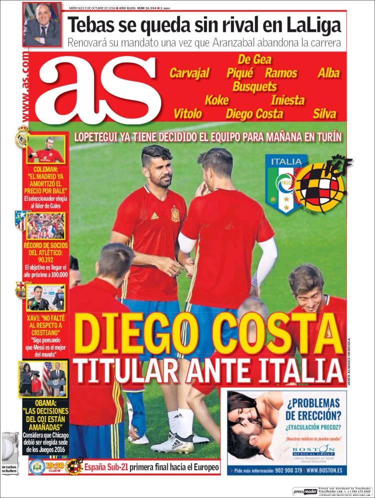 En esta mascarada, destaca como siempre ese maestro del disfraz estilo Mortadelo que es nuestro ínclito diario As. Uno lee su portada, abrazado a Diego Costa, ya saben este tipo tan majo que si jugara en el Real Madrid tendría mil y una órdenes de busca y captura, y no parece a priori encontrar motivos que desacrediten al madridismo. La cosa es más sutil, por supuesto, tan sutil que convierte a Piqué en un muchacho especial y a Arbeloa en un peligro público.