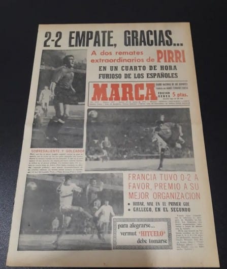 Aquel España - Francia jugado en Valencia acabó con empate a 2 y era la única forma de ver jugar a los mejores jugadores de Olympique de Marsella, del Nantes o del Saint-Étienne, como el meta Carnus, Bosquier, Bereta, Henri Michel, Djorkaeff (padre del que fue campeón del mundo en 1998) o Hervé Revelli, este último autor de los dos goles galos, que fueron contrarrestados por el gran Pirri en la segunda parte. Era un partido no valedero para ninguna clasificación pero que acaparaba la atención de toda España, plantada ante la televisión en blanco y negro a la hora de la cena escuchando posiblemente los comentarios de Matías Prats o de Juan José Castillo.