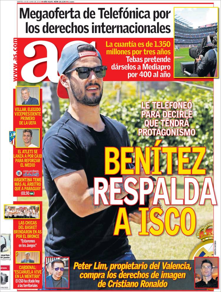 Dadas nuestras tribulaciones nocturnas, agradecemos profundamente a la prensa madrileña que nos haya dado una tregua. No vemos hoy en sus portadas a Ramos ni a Casillas, y de verdad que tal cosa reconforta, alivia y atempera el ritmo cardiaco. Eso no quiere decir que los asuntos que Marca y As destacan sean informaciones de altura, pero quién quiere altura cuando lo que necesita es alejar fantasmas y conciliar el sueño, aunque sea mínimamente. Como resumen de ambas portadas, parece que Rafa Benítez anda trabajando: por un lado, pidiendo la recompra del canterano Lucas Vázquez, hasta ahora jugador del Espanyol; por otro, telefoneando a Isco para empoderarle, asegurándole que "tendrá protagonismo" en el equipo de la nueva temporada. En principio nos parecen muy bien ambas acciones de Rafa, deseando que el habilidoso mediapunta malagueño sepa recibir el mensaje con mesura y sin excesos ególatras. No tenemos por qué dudar de su templanza, pero no nos negarán que es fácil que esta se quiebre si buena parte del entorno periodístico (con perdón) pone el foco en la importancia de que juegue Isco en todo momento, en el inconmensurable último pase de Isco, en el rutilante nuevo caño de Isco, en lo bueno que es Isco, Isco, Isco, mientras los defectos de otros (por ejemplo, de un tal Bale) son ampliados con lupa y se repite como un salmo el precio de su fichaje.