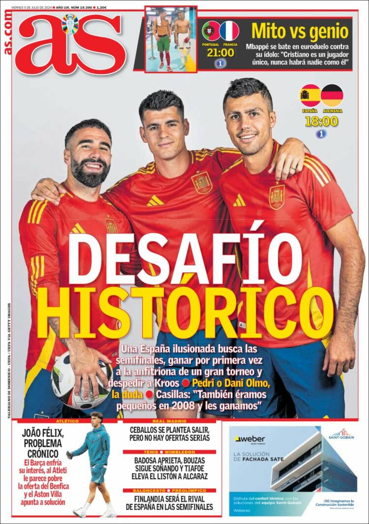 Como veis, As opta por Carvajal, Morata y Rodri(go) como imagen de la selección, a la que sitúa, no sin razón, ante un "desafío histórico". Dice además que España busca tres cosas: