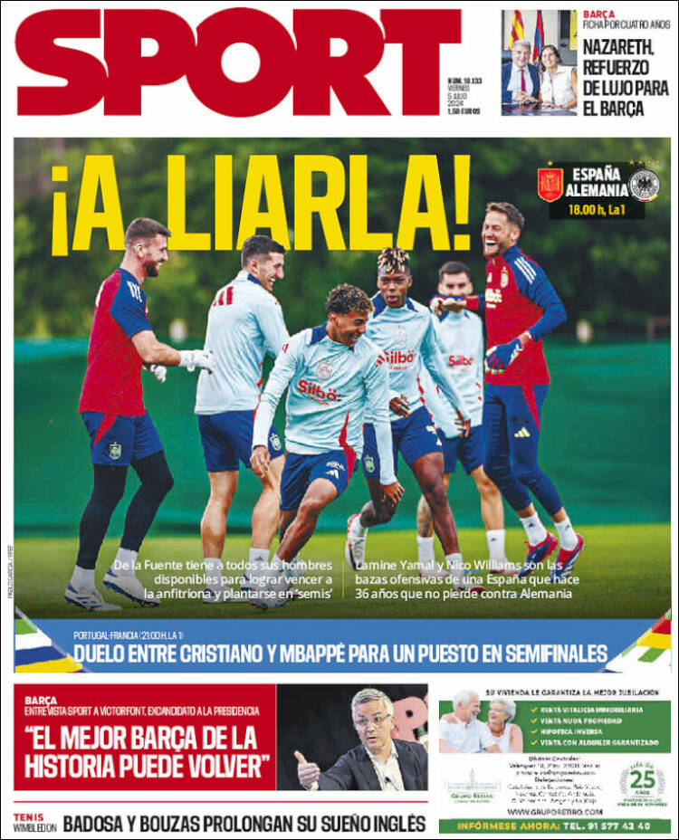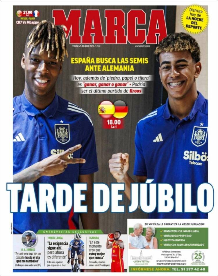 Marca, por su parte, prefiere la imagen del dúo de moda, Nico Williams y Lamine Yamal, para ilustrar esta previa. Es normal, pues están siendo la sensación del campeonato hasta el momento, junto con Güler y los goles decisivos de Bellingham. Ya en Marca encontramos la primera alusión (habrá otras en otras portadas) al "Piedra, papel o tijera" al que tanto jugamos en nuestra niñez. Parece ser que Nico y Lamine, en la amistad que les une, suelen dirimir sus pequeñas y joviales disputas personales con ese mecanismo. Ya sabéis: sacáis la manos a la vez, cada uno con un gesto improvisado. La piedra se carga la tijera, pero es envuelta por el papel, que a su vez es cortado por la tijera. Nos llegan rumores de que es el mismo sistema que utilizan Medina Cantalejo y Clos Gómez para decidir cuál de los dos se mete personalmente en el VAR para asegurarse de que las cosas se hacen adecuadamente.