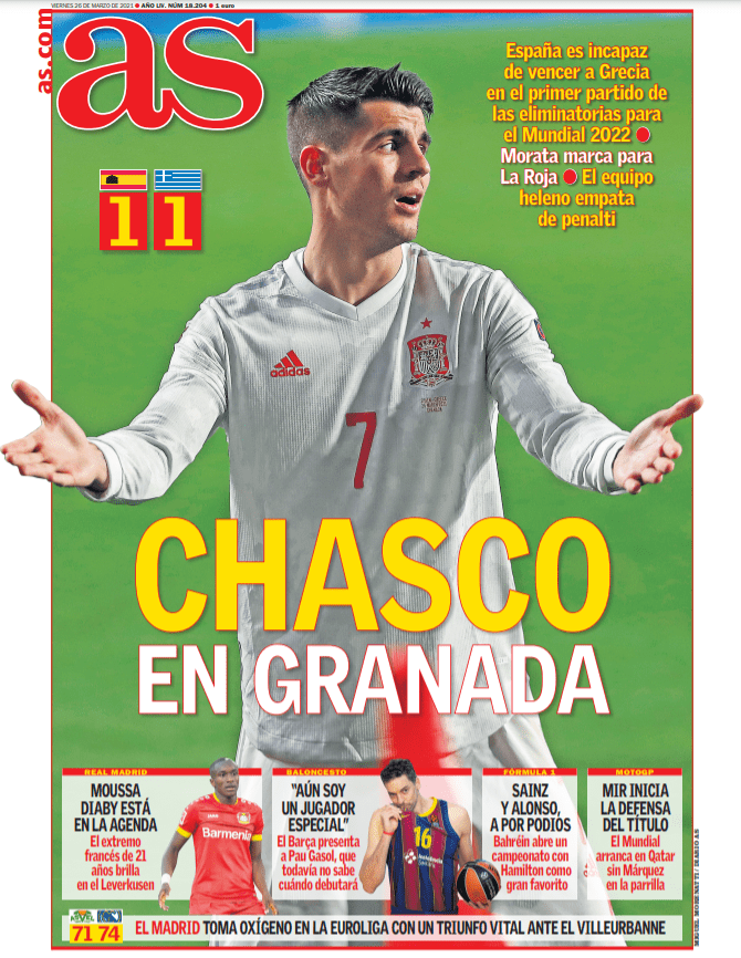 Estaba mucho más pendiente del partido de los de baloncesto en Lyon de los nuestros que de la Floja,y eso que para ver el basket hay que tirar de links. Pero ni que decir que me encanta ese empate contra la todopoderosa Grecia, tanta posesión y tantos pases insulsos para nada, hasta MorRata sale en la portada de As con su eterna cara de pena y desesperacion , épico.