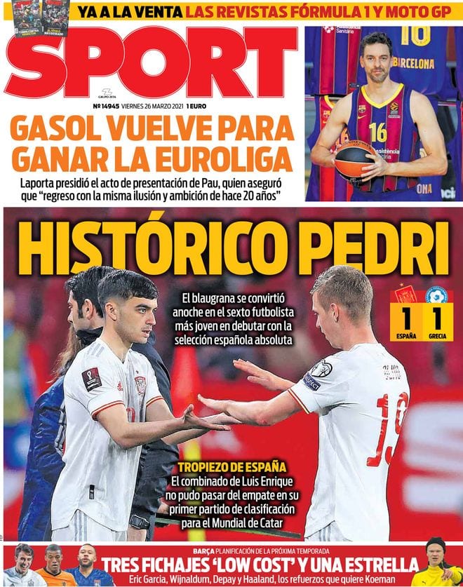 A todo esto, España empató ayer con Grecia. De esto van, casi con unanimidad, las portadas de hoy, aunque a Sport solo parece importarle el debut de Pedri. Ni rastro de los pingüinos pero, nuevamente, ni rastro de Roures o Tebas tampoco. Ningüino de los dos aparece, si nos permitís este guiño al legendario Diccionario de José Luis Coll (“¡Ningüino!: Exclamación del cazador de pingüinos cuando llega y encuentra que no queda ni uno solo”).