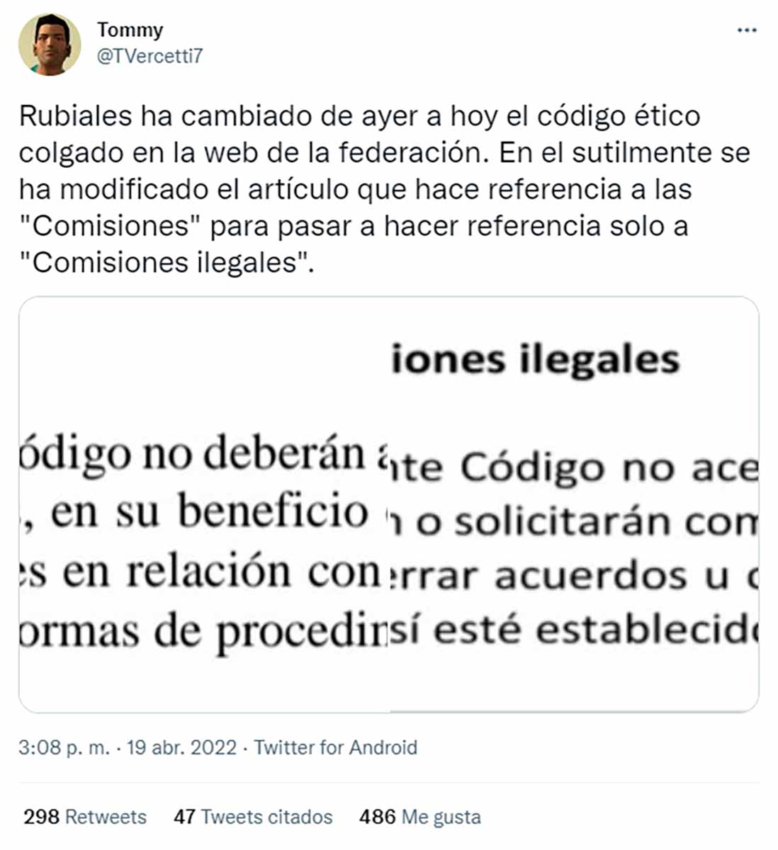 Pero atención, porque según escribimos estas líneas nos llega otra perla de valor incalculable. Lo que acabáis de leer es el Código Ético de la RFEF tal como estaba ayer. Consciente de que podía ser mostrado al público por espíritus críticos como Richard Dees, Rubiales ha mandado cambiarlo con nocturnidad y alevosía. Nos toma por idiotas. ¿Se puede ser más tosco, torpe y chapucero?