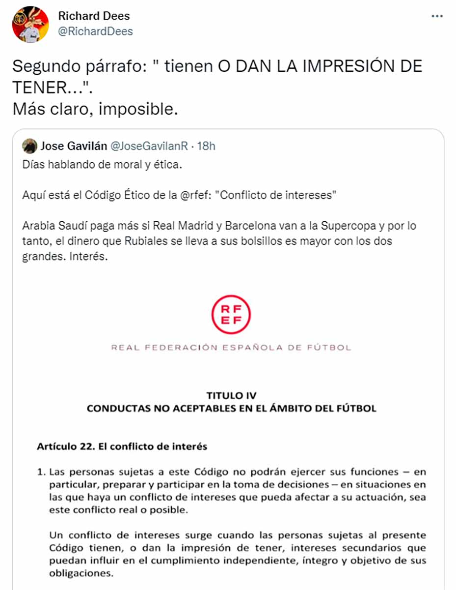 Es normal que la vergüenza aún colee. A estas horas, todavía queda quien niega el manifiesto conflicto de intereses que ya intuíamos, pero que los audios revelados por El Confidencial ponen de manifiesto de modo patente, entre el hecho de jugar en el Barça y hacer negocios con el jefe de los árbitros, como lo hay entre ser el jefe de los árbitros y meterte en chanchullos que acrecienten o disminuyan tu renta personal en función de cómo quede la clasificación de los equipos en liza. Por si había alguna duda sobre el conflicto de intereses, nuestro amigo Richard Dees nos presentaba ayer el Código Ético de la RFEF, que es transparente.