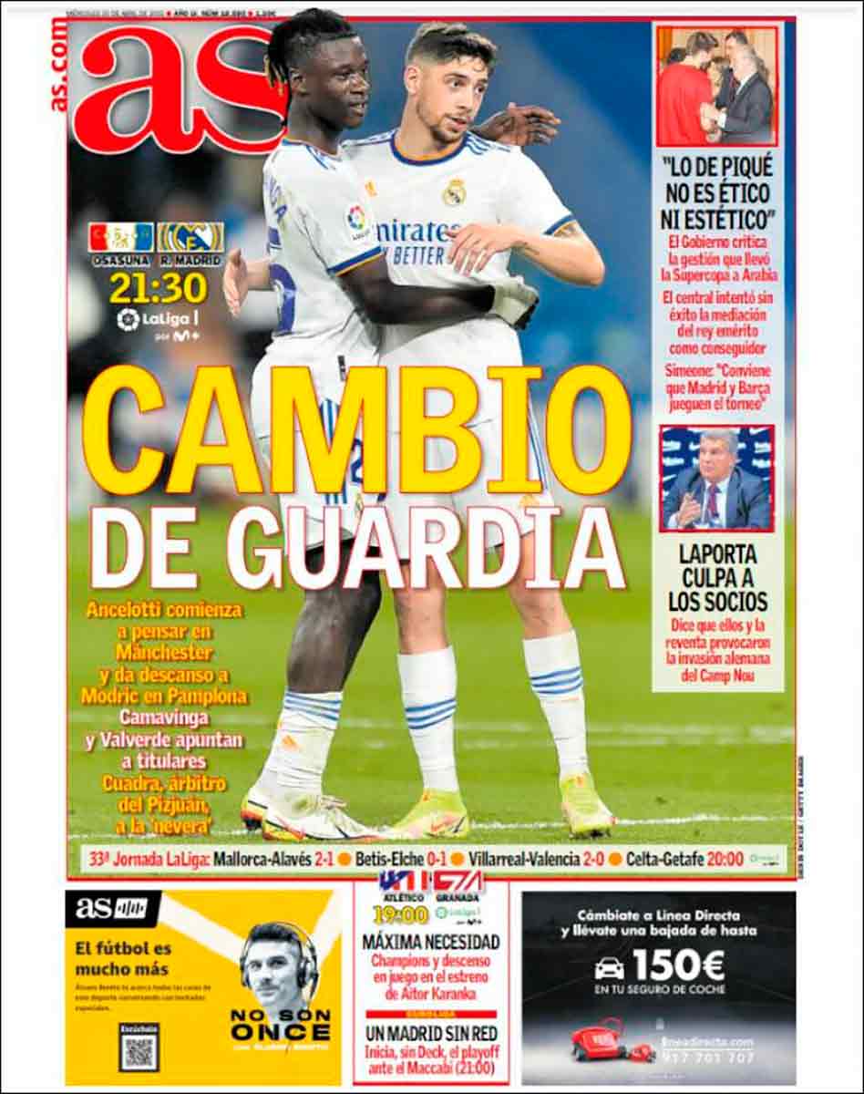 No olvidamos que estamos aquí para comentar portadas, pero comprenderéis que la contraprogramación es brutal. Esta noche juega el Madrid, que tiene la Liga completamente a tiro a pesar de navegar en las aguas procelosas de las que os hablamos. As plantea un cambio de guardia (Valverde y Camavinga IN) que en realidad trasciende al partido de Pamplona hoy a las 21:30, y se refiere al futuro a medio plazo del equipo. Valverde-Camavinga debe ser el eje del Madrid del futuro, y deben ir asumiendo responsabilidades a la altura de lo que se espera de ambos. También informa la portada de As de la postura del gobierno, que también ha mostrado a través del CSD su preocupación “estética y ética” por el GeriGate.