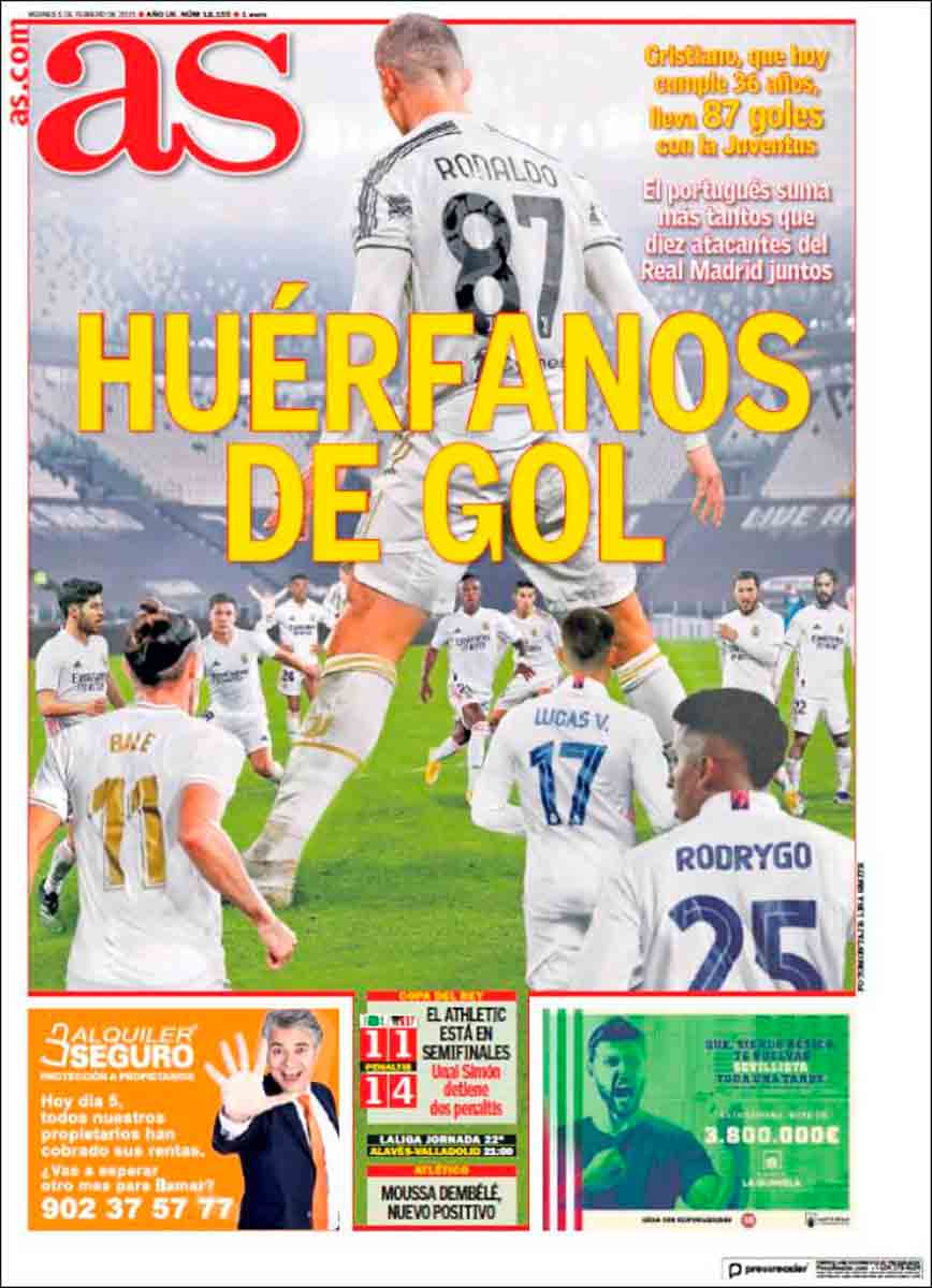La portada de As linda con la falta de respeto pintando como enanos a todos los delanteros madridistas, a la sombra del gigante portugués. (No vemos a Benzema en la portada, seguramente porque el francés sí tiene buenas cifras goleadoras). En todo caso, es innegable que la aportación goleadora de los que sí aparecen es manifiestamente mejorable. Algunos habrán podido ser errores cometidos en el mercado y otros no haber sido explotados convenientemente por el entrenador, de todo habrá. Sabemos que estamos en el postcristianismo y que es duro, pero no porque nos lo diga As. También sabemos que el divorcio entre Cristiano y el Madrid fue un mal divorcio. Inevitable tal vez, pero malo para ambas partes. La dureza del postcristianismo no trae consigo una conclusión clara respecto a cuál era el momento idóneo para comenzar esa travesía del desierto. Se consiguió una Liga, que puede ser a ese desierto el correspondiente oasis y nada más. Esperemos que no. Hacen falta cambios profundos en la plantilla y esperamos que se puedan ejecutar al término de esta campaña, pese a las inmensas dificultades que acarrea la era Covid. Mbappé, que viene a la portada de Marca, podría formar parte de la solución.