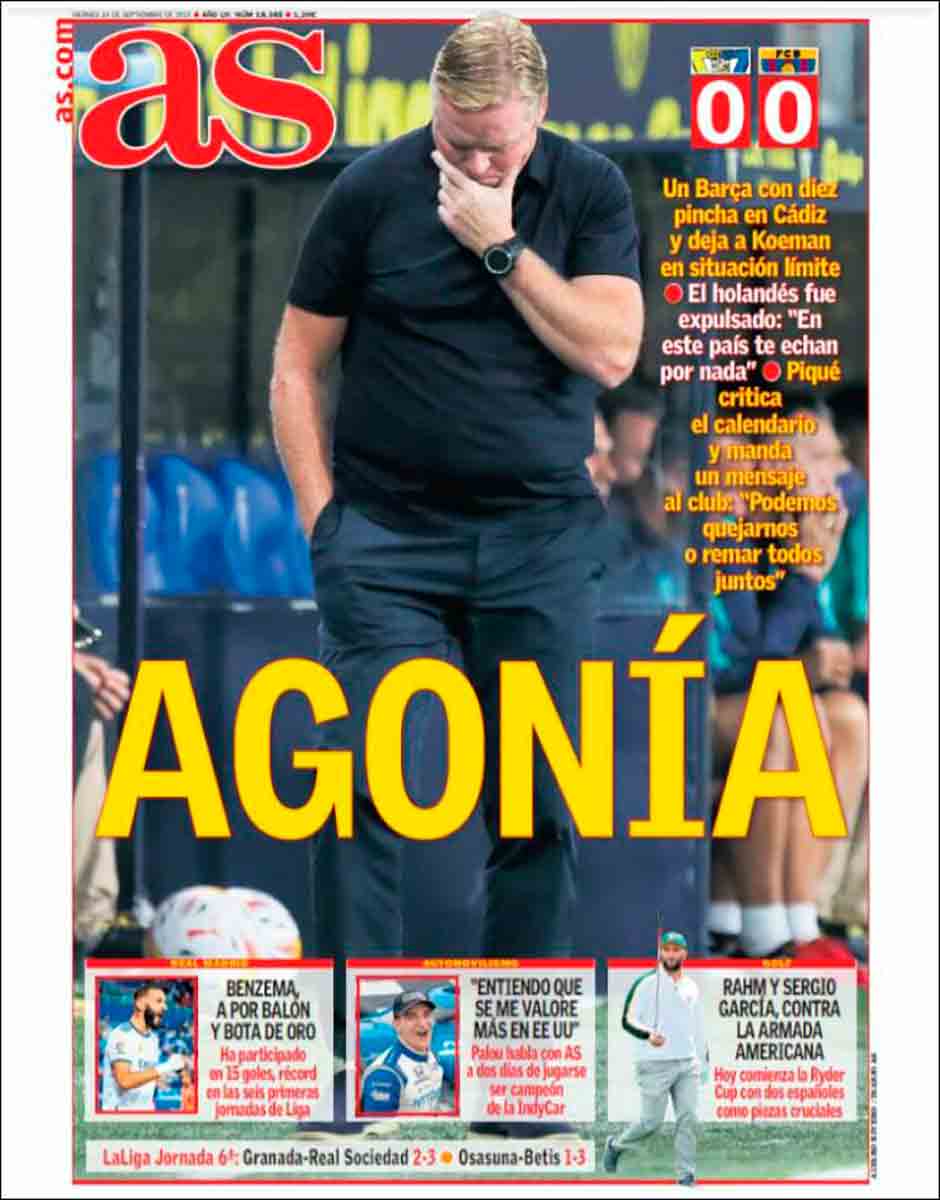 Buenos días. La crisis galopante del Barça, con sus ramificaciones tanto financieras como deportivas, obra también algún que otro milagro en nosotros. Por ejemplo, nos lleva hoy a dar la razón a Piqué, cosa que no sucede todos los días. Los de Koeman (que en pocas fechas pueden dejar de serlo) no pudieron pasar del empate a cero ante el Cádiz, lo que no es ya que haya destapado la caja de los truenos, sino que los ha invitado a quedarse y hacer merienda cena, de suerte que la tormenta se ha instalado en los aledaños del Camp Nou y hasta dicen que es una canterana más de la Masía.