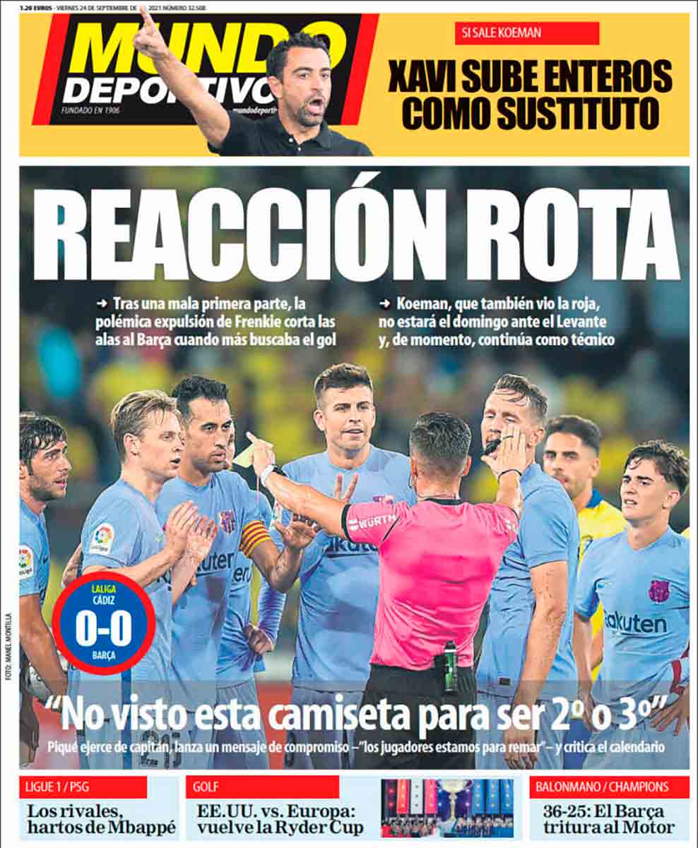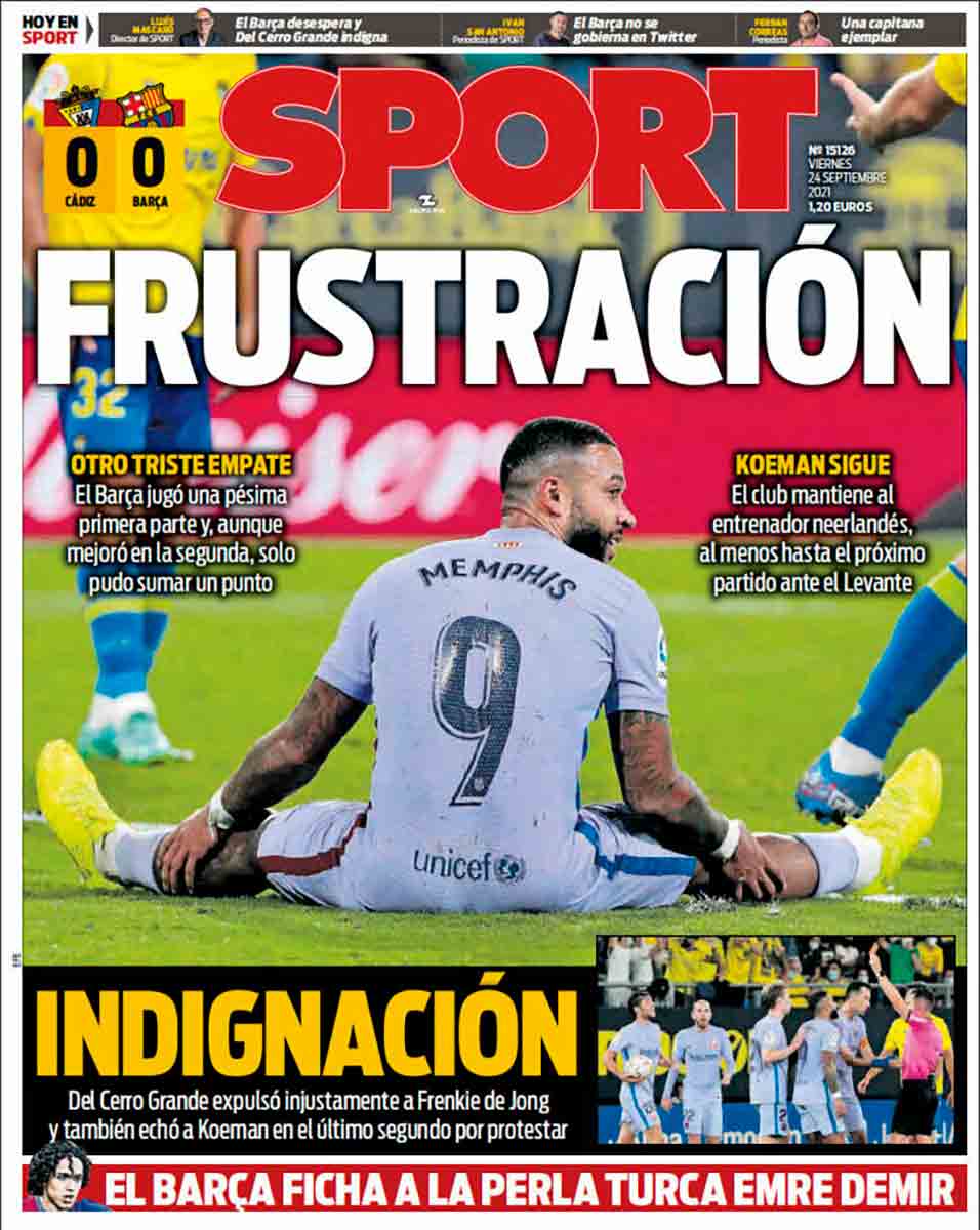 “Frustración” e “indignación” son las dos palabras que presiden la primera plana de Sport. “Frustración” un poco más grande que “Indignación”, hecho del cual tal vez discrepen algunos socis, más indignados que frustrados, y ante el cual acaso aplaudan todos aquellos aficionados culés cuyas almas estén más frustradas que indignadas. Habrá incluso quien esté solo frustrado o solo indignado, y a quienes esta portada, por tanto, habrá indignado hasta más allá de la frustración, si bien por razones opuestas, o habrá frustrado más allá de la indignación. Lo que tienen en común la indignación y la frustración es, básicamente, la mala leche que sirve como sustento a ambas, y que aparte de la falta de gol aquí procede al parecer de la expulsión injusta de Frenkie De Jong. Vaya esta expulsión injusta por todas las veces que alguien del Barça la mereció sin alcanzarla. La última vez que recibimos la noticia de la expulsión liguera de un jugador blaugrana estábamos de visita en el World Trade Center de Manhattan, y nos llamó al móvil nuestro hermano para darnos la buena nueva, dado que —a su vez— la anterior expulsión de un jugador blaugrana había tenido lugar bajo la presidencia de Adolfo Suárez.