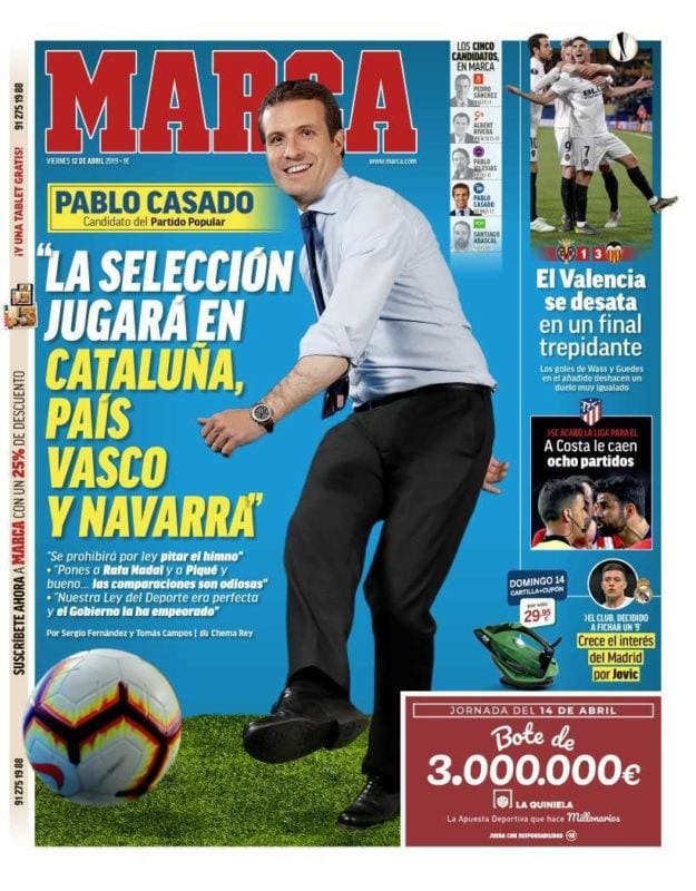 En efecto. En su serie de entrevistas con los principales candidatos del 28-A, Marca hace llegar su turno a Pablo Casado, quien (además de expresar su deseo de que la selección nacional juegue en territorios donde su presencia está oficiosamente vedada) apunta a las diferencias entre el propio Piqué y Rafael Nadal. Hay que reconocerle imaginación al candidato popular, porque es un “frente a frente” que jamás se nos habría ocurrido ensayar. La distinta talla humana a ambos lados del espejo hace poco menos que inimaginable la propia comparación. A quién se le ocurriría comparar a Vargas Llosa con Ricardo Bofill Jr.?
