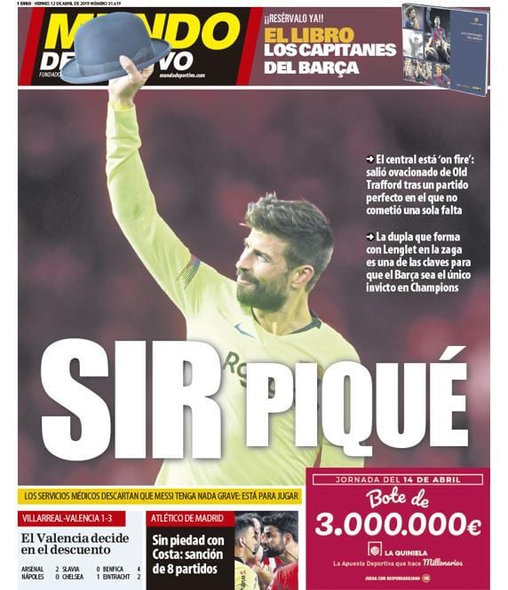 Aprovechando el buen partido de Piqué en Manchester, así como el hecho de que alguien le arrojara desde la grada lo que parece ser un bombín, los de Nolla optan por titular “Sir Piqué”. La palabra Sir, en inglés, debe ser utilizada solo para quien ostente el titulo y antecediendo bien al nombre completo (nombre + apellido), bien solo al nombre de pila, como sucede en castellano con el uso de la forma Don. Es decir, debería ser, en todo caso, bien Sir Gerard Piqué, bien simplemente Sir Gerard, pero en ningún caso Sir Piqué, lo que sería como llamarle Don Piqué. Todo ello en el supuesto de que Gerard Piqué hubiera merecido en algún momento de su vida esa distinción, ya fuere por soltar gapos en la coronilla de directivos de la RFEF, ya por encararse con la guardia urbana al grito de “Usted no sabe quién soy yo”, ya por insultar a compañeros de profesión o por mofarse de aficiones rivales o por faltar al respeto al himno nacional o por. O por.