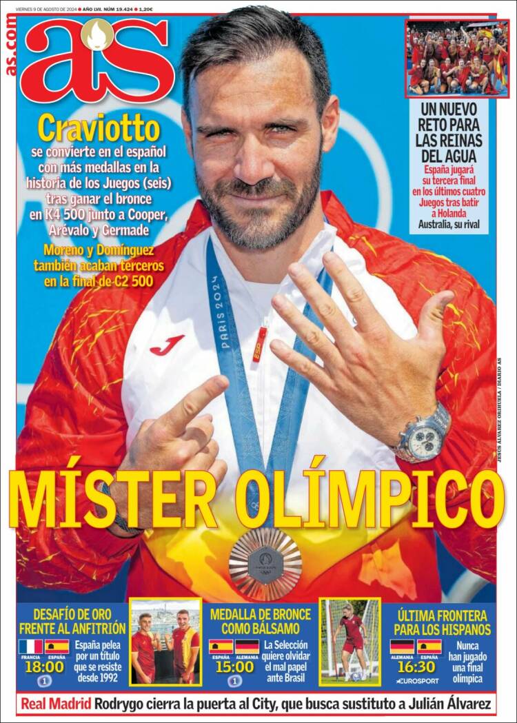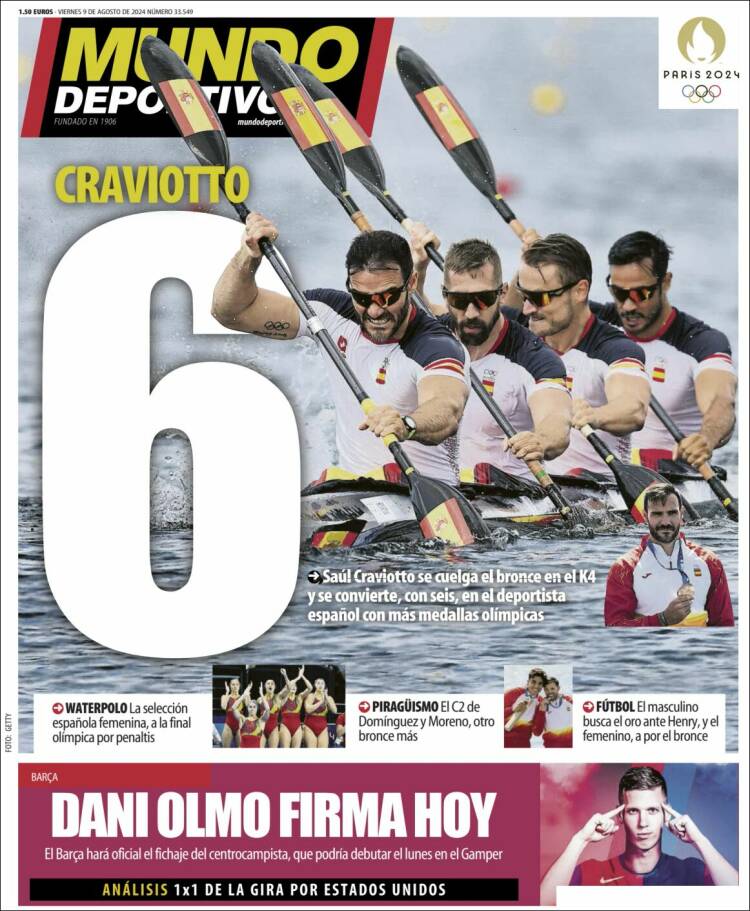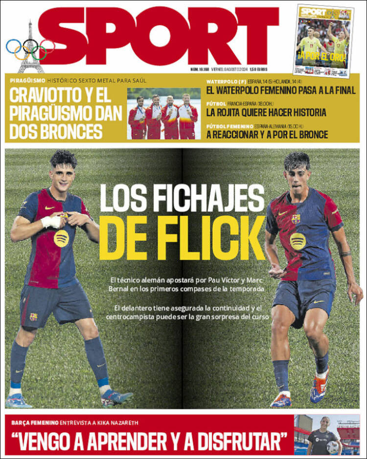 La única de las portadas que no dedica la mayor parte de su espacio a los éxitos acuosos del atletismo español en París es la de Sport, que pondera a los jóvenes canteranos culés que tan buen rendimiento han ofrecido en esta pretemporada.