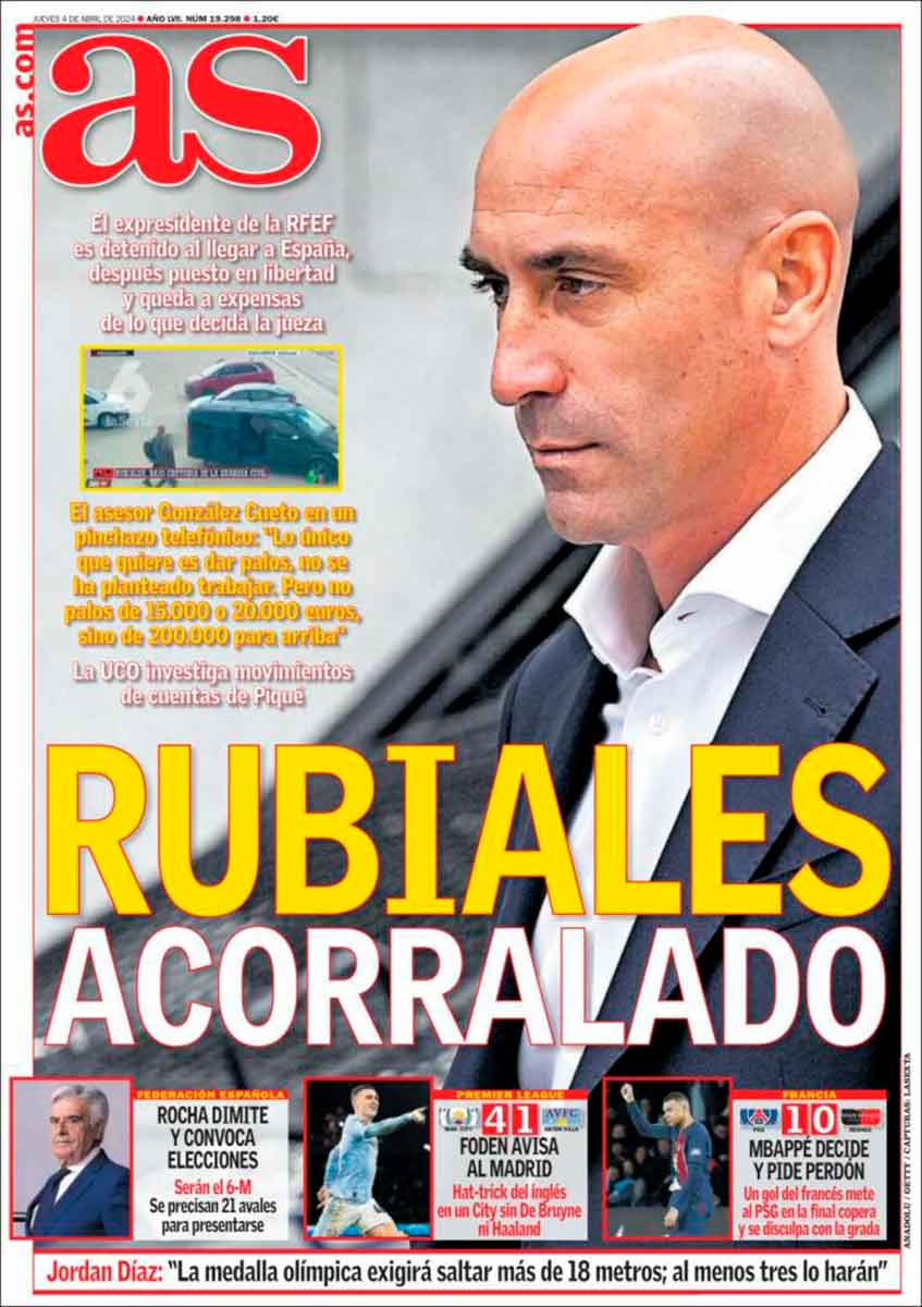 Comentábamos el martes que en ocasiones sentimos déjà vues al leer las portadas. Hoy nos sucede con esta, Sport ya titulaba «Acorralado» sobre una imagen de Luis Rubiales el pasado 21 de marzo. Fue con motivo del registro de la sede de Las Rozas y otros once domicilios llevado a cabo por la UCO en el marco de la investigación de presuntas tramas de corrupción que según sospecha la Fiscalía podrían estar encabezadas por el expresidente de la RFEF. Ayer se produjo una nueva entrega de esta serie: la detención y puesta en libertad de Rubiales por parte de la Guardia Civil a su llegada a España, a cuyo momento dedica el frontispicio As con el titular: «Rubiales acorralado», sin coma elíptica, aunque al parecer estas cosas se justifican con el cambio de línea, de color, de tamaño, etc.
