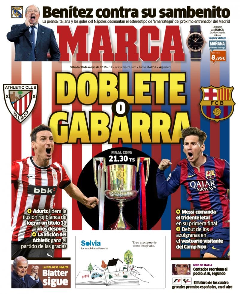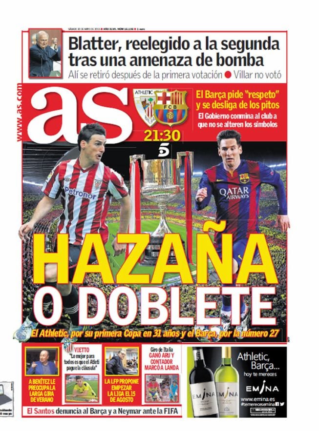 Menos espacio le dedica As a la final de Copa, dando por favorito al Barcelona en su titular. Aduriz y Messi son los protagonistas gráficos elegidos, en un diseño tan original como el de Marca y como el de cuarenta y cinco mil setecientas portadas que hayamos visto. El Diario de la Ouija sí entra al trapo de los posibles pitos, pero advirtiendo que el Barcelona es una institución que nunca -pero nunca jamás de lo que se dice nunca- ha osado transitar por esas sendas que mezclan política y fútbol. Es bien sabido que si el Barcelona es més que un club es justamente por esta firme delimitación de parcelas, y solo por eso. En consecuencia, nada tienen que ver con lema tan humilde noticias como la que -perdonen que vayamos a por la lupa- aparece muy abajo en la portada de As: "El Santos denuncia al Barça y a Neymar ante la FIFA". Qué gente insolidaria esta del Santos, qué ganas de aguar la fiesta blaugrana, qué falta de consideración con un ocupadísimo Blatter, noble trabajador en pos de la limpieza, la justicia y la moral universal. No como Florentino, un tipo que organiza unas giras larguísimas en verano, que -dice As- preocupan a Benítez, en perfecta coherencia con la preocupación, siempre bienintencionada, de Relaño.