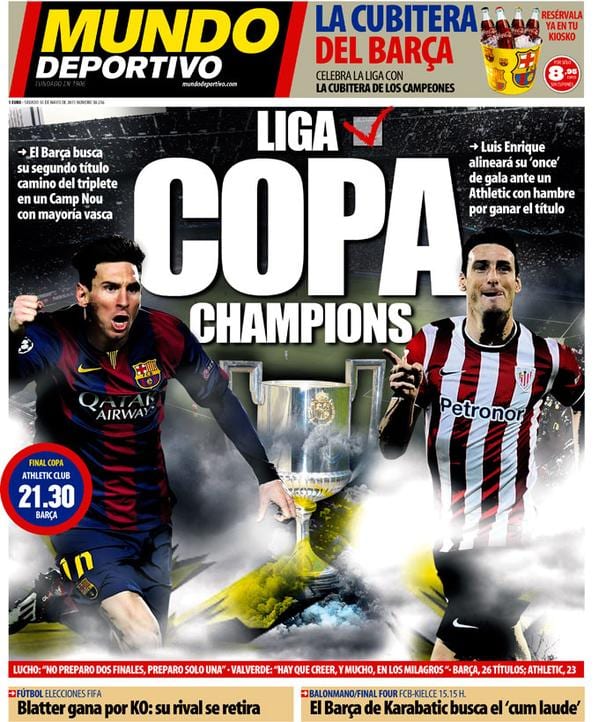 Confirmando el gesto de originalidad de As y Marca, Mundo Deportivo también presenta a Aduriz y Messi en su portada, con la brillante aportación de colocar al argentino en el lado izquierdo y al español (con perdón) en el lado derecho. Impresionante hallazgo estético-formal, agrandado aún más si cabe por repetir también la innovación de colocar el trofeo de esta noche en medio de ambos. Las facultades de diseño y bellas artes tienen aquí -y no solo hoy- todo un filón por explotar. Por lo demás, qué aficionado al fútbol -pero al fútbol fútbol- no querría la cubitera del Barça para simplemente admirarla y no usarla, no mancillarla, no osar beber nada que contenga. Ya deberían saber que el goce máximo está en los preliminares y no en la ingesta, no en los goles, esos impostores.