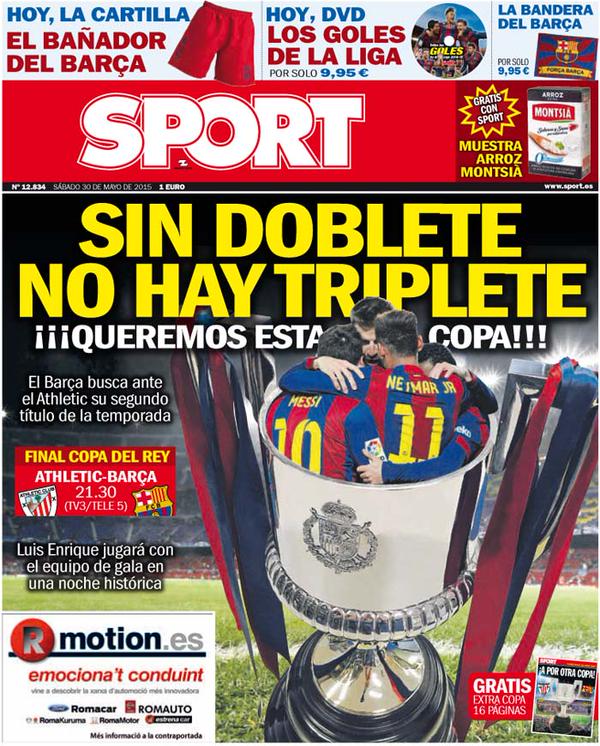 Pero disculpen que escribamos estas últimas líneas de pie y sin sombrero, ante la maravilla del diseño que nos ofrece hoy Sport: una Copa del Rey con varios jugadores del Barcelona colmando su interior. Bravo. Qué belleza, qué alarde kitsch, tal vez en juguetona alusión a la cubitera que ofrece la competencia de Mundo Deportivo. Siendo notable el montaje, no alcanza las altas cotas de calidad de las palabras que ocupan la portada: "Sin doblete no hay triplete", dice Sport, y no podemos más que aplaudir ante la brillante tautología, propia de un poeta, un filósofo, o un niño de cuatro años, con perdón para los niños de cuatro años. Pero hay más, porque es ya sobresaliente el subtítulo, donde la exclamación se eleva hasta la gloriosa incorrección ortográfica. "¡¡¡Queremos esta copa!!!", grita Sport, así, con tres signos a cada lado, acaso para que se oiga hasta en Qatar y para que la RAE, esa apolillada institución española, sienta en el cogote el aliento del desafío lingüístico. No conviene relajarse en eso de ser més que un club.