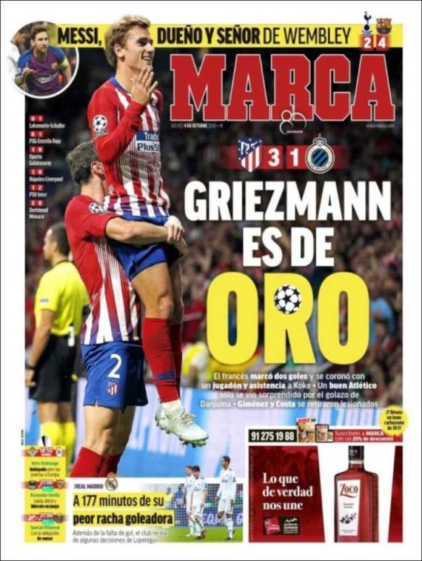 El segundo futbolista del día es Griezmann, que viene a la portada de Marca con todos los honores de un héroe de Fornite, que es una cosa a la que juegan Griezmann y los hijos de Jesús Bengoechea sin que esta coincidencia deba preocuparnos más allá de lo que se preocupan dos niños de 10 y 8 años cuando les matan al llegar a las dunas.