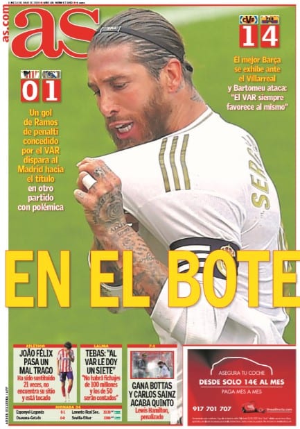 “En el bote”, sí, pero “en otro partido con polémica”. Es mentira que esté en el bote (faltan doce puntos por disputarse y la ventaja es de cuatro) como es mentira que el partido tuviera polémica. El partido tuvo la polémica absolutamente artificial que el propio As quiso crear en la crónica de Luis Nieto y en la portada de hoy. El partido tuvo la polémica absolutamente artificial creada por las televisiones y las radios con sede tanto en Barcelona como en Madrid que, en su afán por vender controversia, no reparan en intentar dañar el crédito del campeonato que se dispone a ganar el equipo por el que profesan devoción la mayoría de sus televidentes, oyentes y lectores. Es la gran charada nacional, ese patio de corrala en el cual el Barcelona puede encadenar 107 partidos con solo dos penaltis en contra sin que un solo plumilla levante una ceja, pero donde con el Real Madrid no puede actuar el VAR para darle la razón cuando la tiene. Porque la tiene.
