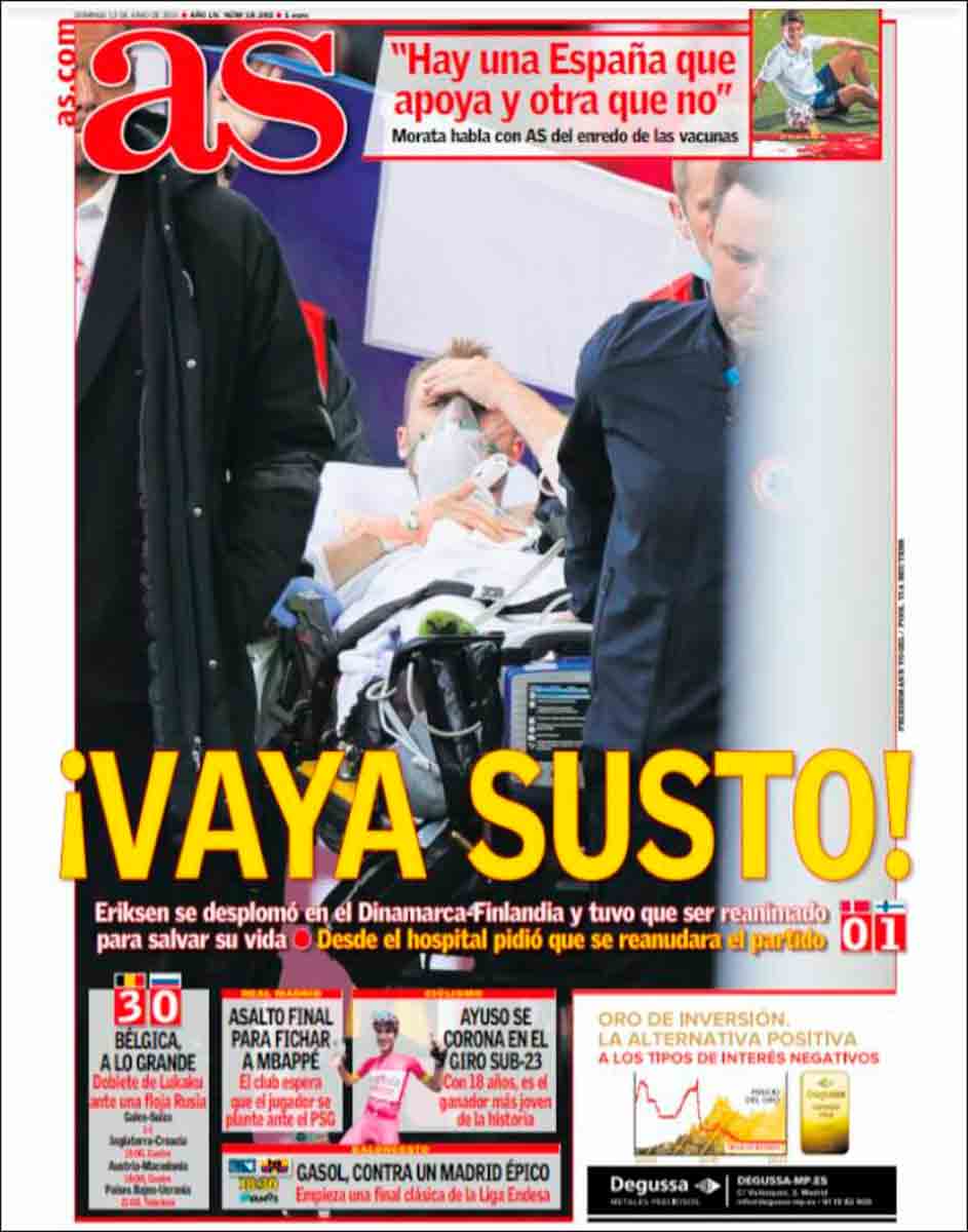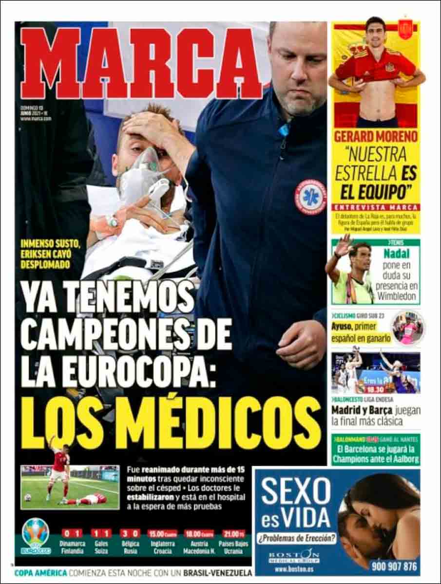 Hasta que Sport decide, horas después, que la noticia del día es el fichaje de Depay por el Barcelona y relega a un segundo plano lo que más importa, lo único que importa. Y entonces, ya decimos, poco hay que analizar hoy, queridos galernautas. Se analiza solo. Se retratan solos los carroñeros, la UEFA y Sport. Nosotros solo veníamos a celebrar que Eriksen esté fuera de peligro, que respire y hable, que haya médicos y capitanes y equipos, que esto del fútbol sea tan solo una de las maneras posibles de seguir viviendo la vida. Sobre todo, hoy, para Christian Eriksen y sus seres queridos.