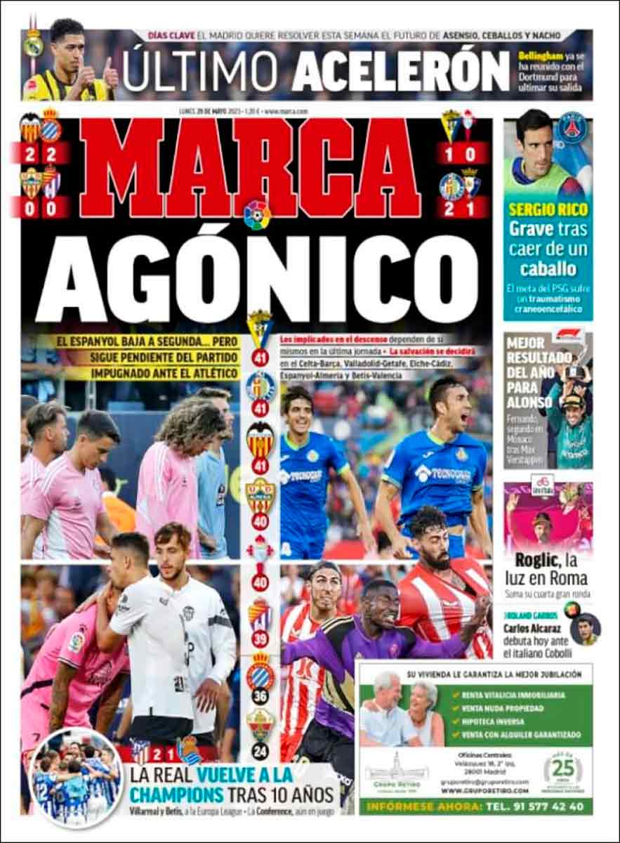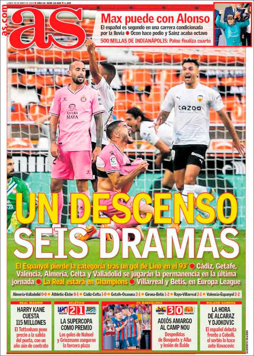 Y poco más que contaros, amics. Que el tema de los descensos está que arde, como reflejan las portadas de As y Marca. Al pobre Espanyol ya se lo han llevado a Segunda, que para eso ha decretado Roures que el Girona ha de ser por fuerza el segundo equipo de Cataluña.