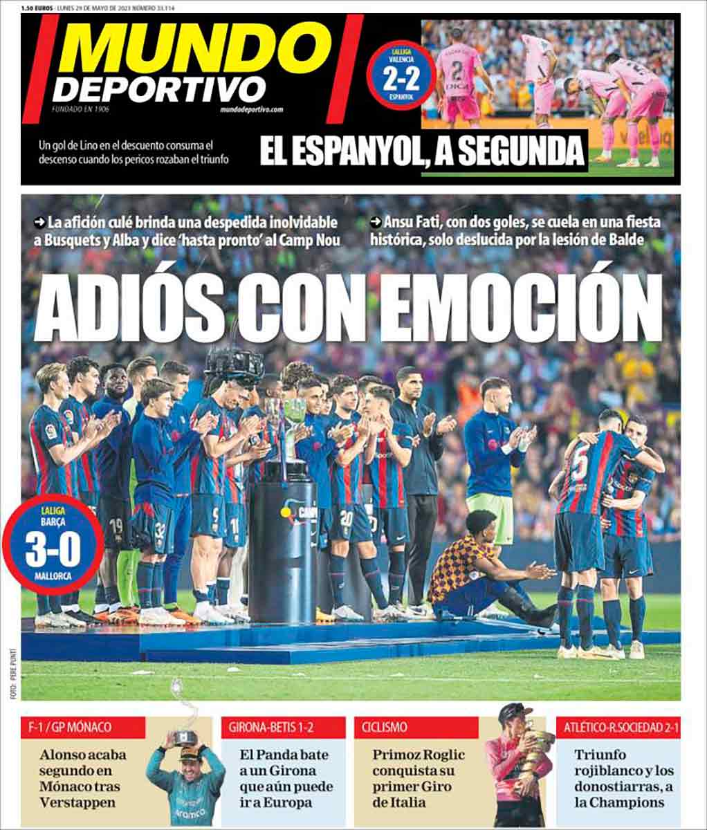 “Adiós con emoción”, titula Mundo Deportivo, y creednos si os aseguramos que compartimos el sentimiento. El adiós y la emoción, cuidado, no van destinados en exclusividad al Escroti, sino también a dos jugadores históricos de la entidad blaugrana que la dejan. Nos referimos a Jordi Alba y Busquets, jugadores de gran calado a quienes no dudaremos en homenajear también nosotros, siendo como es su amplio palmarés en el Barça tan ajeno al trato comercial entre su club y el negreirismo como el dopaje era ajeno a los Tours de Lance Armstrong y los récords del mundo de 100 metros lisos a Ben Johnson.