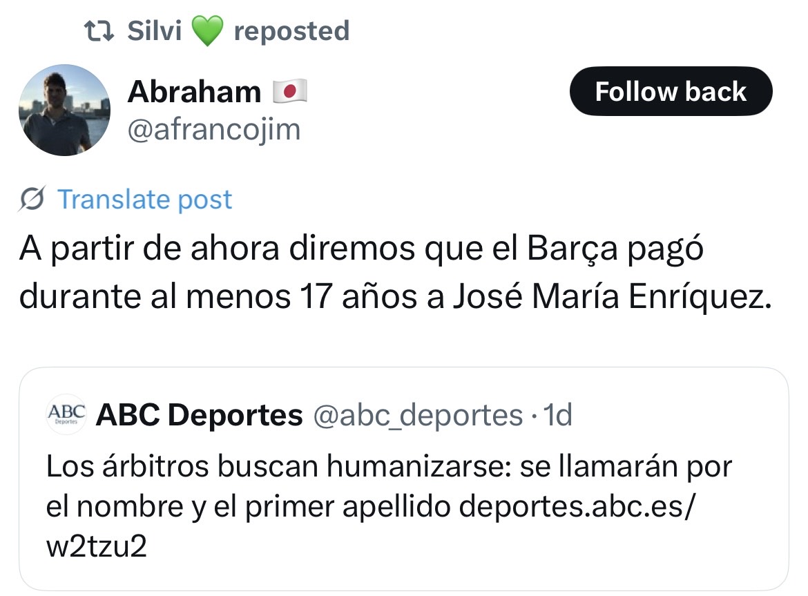 Se nos antoja sumamente esperanzador que este nuevo árbitro de Primera sea al menos consciente de la dimensión del problema, y del protagonismo que el sinvergüenza de Negreira lleva teniendo, desde nada menos que 1993 (¿y antes aún?) en los éxitos de su club cliente.