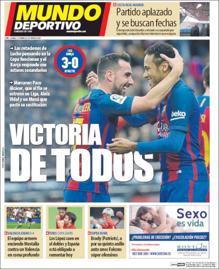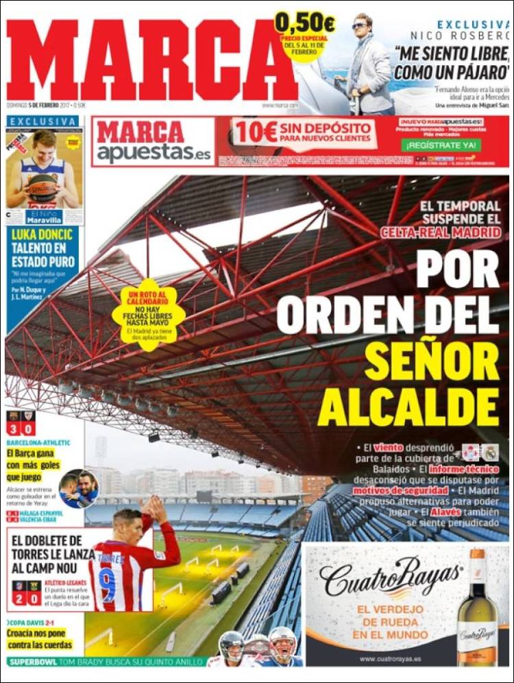 Yo sigo con mis preguntas. En Jugones acaban de decir que el día en Vigo hoy es expléndido... ¿Por qué no se ha esperado hasta una hora antes del partido, como se hace siempre, para suspender o no el partido? Reitero mi opinión: "Es el Celta quien no quería jugar el partido de ninguna de las maneras para poder jugarlo con todos sus titulares y llegar descansado a la eliminatoria de Copa"