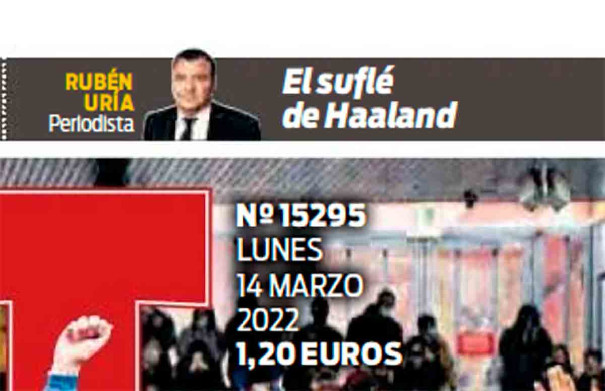 En la primera plana de Sport sí que encontramos, en cambio, algo sobre Haaland, aunque hay que buscarlo con microscopio. Aquí sí hay alguien que se atreve a hablar sobre el gatillazo noruego. Se trata de Rubén Uría, cuyo artículo se anuncia en pequeñito en el frontispicio, bajo el título “El suflé de Haaland”.