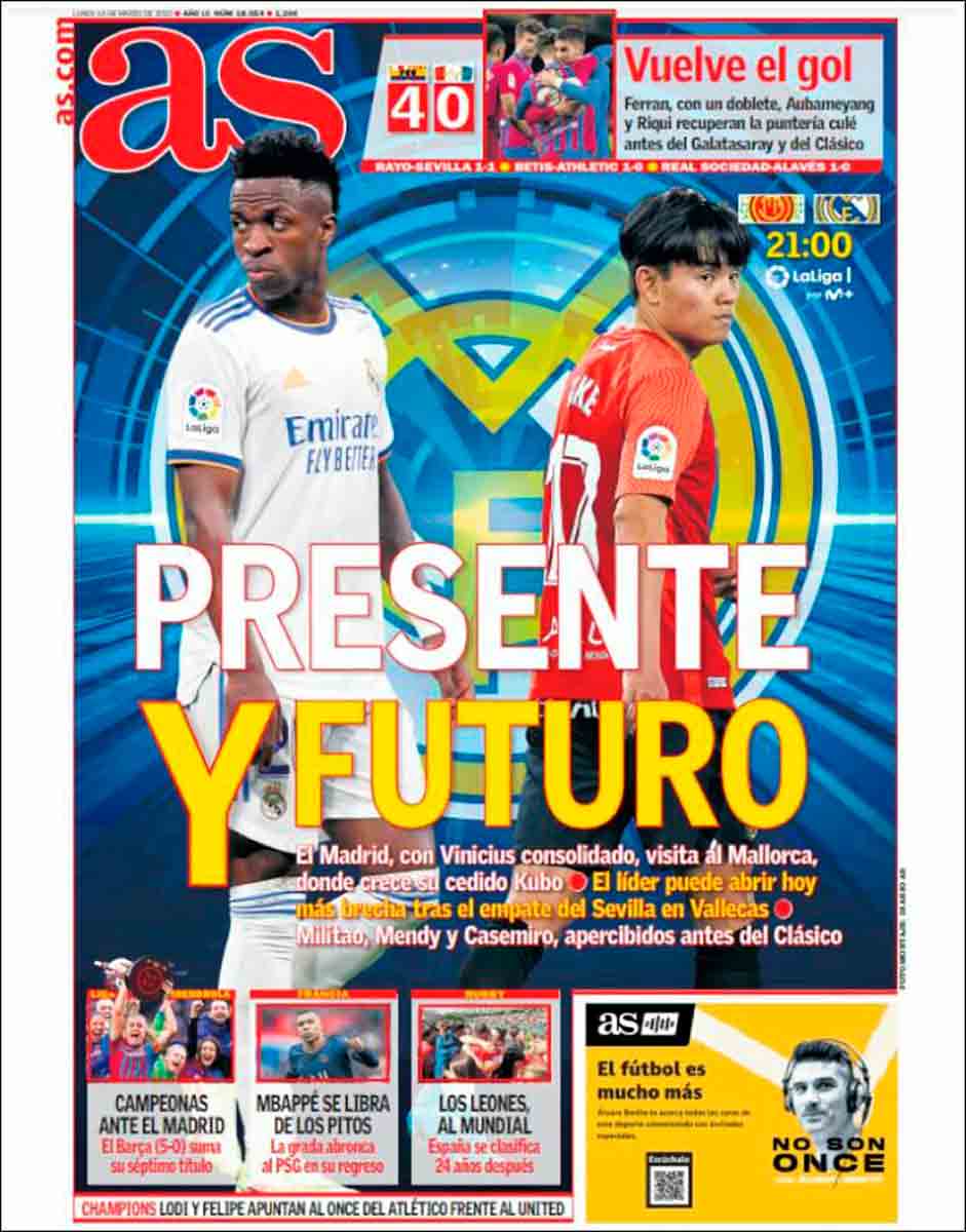 As opta por ofrecer los principales honores de portada para Vinicius Jr. y para Takefusa Kubo, a quien identifica con el “futuro” mientras Vini sería el “presente”. No está mal tirado. Hoy se verán las caras en Mallorca, en un encuentro decisivo para el Madrid, que puede elevar a diez los puntos de ventaja sobre su inmediato perseguidor, el Sevilla, que empató con el Rayo. Es un partido crucial para ganar tranquilidad de cara al título de Liga, y poder de este modo manejar las piezas entre Liga y Champions con mayor desahogo. Diez puntos de renta no serían definitivos, pero sí muy significativos. Es así que toca descender de las nubes de euforia post-PSG para volver al campeonato local, con sus canchas plagadas de minas en forma de patadas impunes, sus realizadores de televisión parciales y sus sanchezmartíneces correspondientes (¿no le decíamos antes a Rubén que Mateu no es el único?). Sí, amigos, nos pita Sánchez-te-la-has-jugado-mucho-Albiol-Martínez, y los caballos enfermos de cólera relinchan a lo lejos.