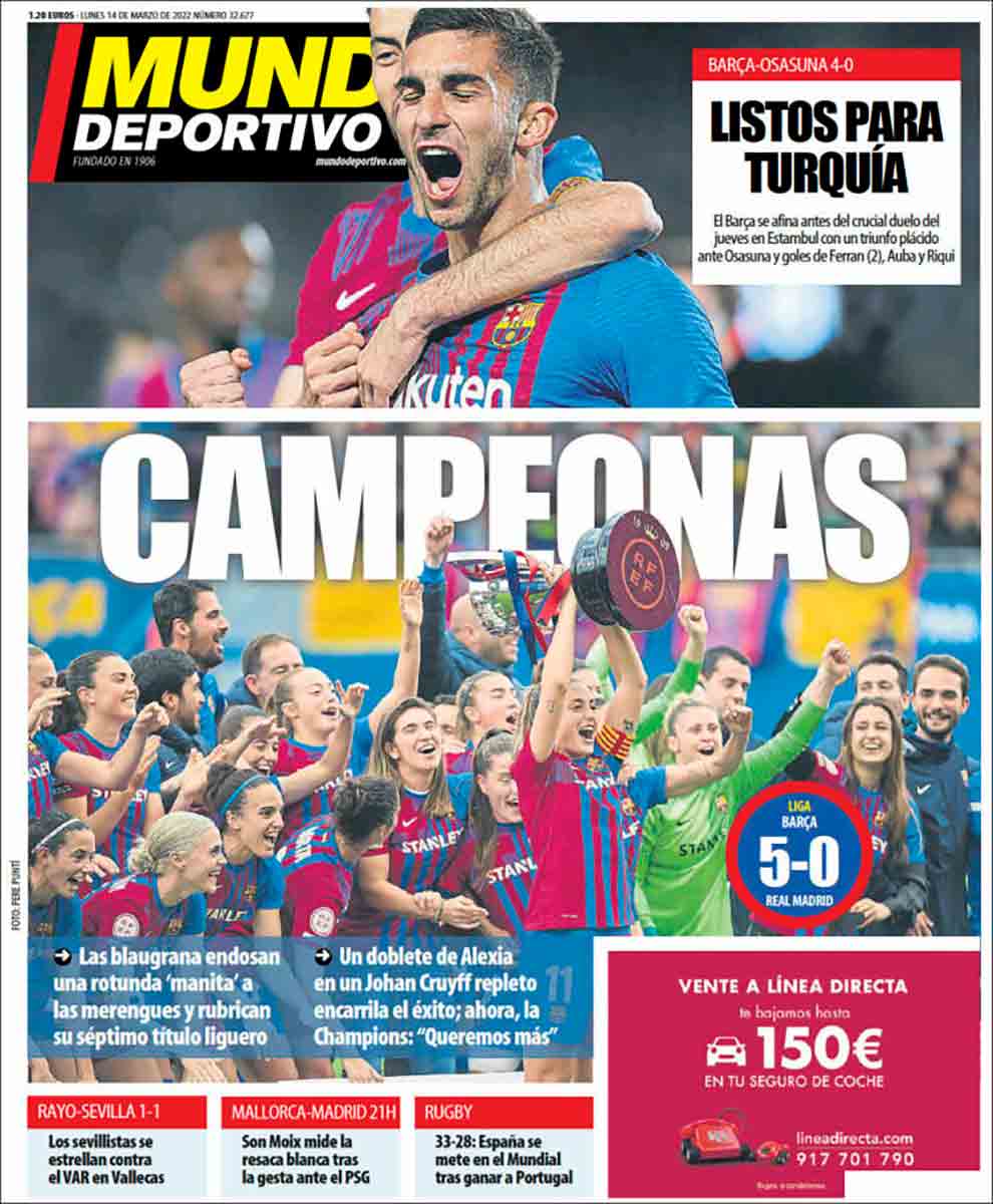 Curiosamente, no vemos resto alguna de las declaraciones-bajonazo de Laporta, que son la auténtica noticia culé del día, en la portada de Mundo Deportivo. Repasadla con nosotros. ¿Veis algo? Claro que no, chicos, ¿acaso alguna vez habéis visto a alguien hacer propaganda de cosas chungas? Les ha venido Dios a ver (no d10s, que está en horas bajas, abucheado en París) con la Liga de las chicas y la rotunda victoria ante Osasuna, porque de lo contrario habría que haber pinchado el globo de Erling Haaland con luz y taquígrafos.